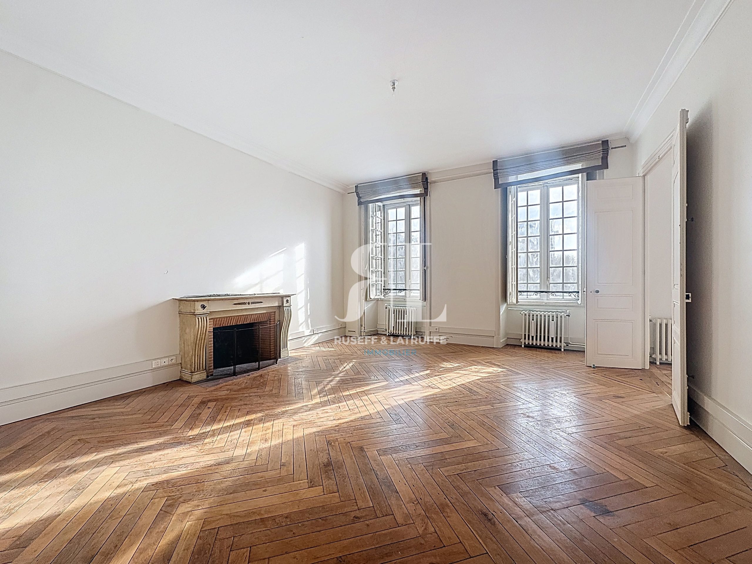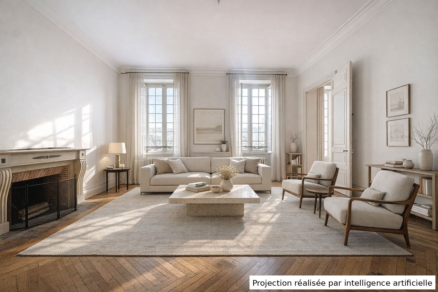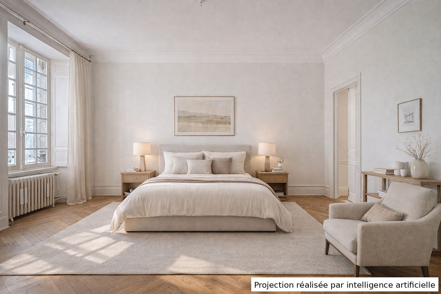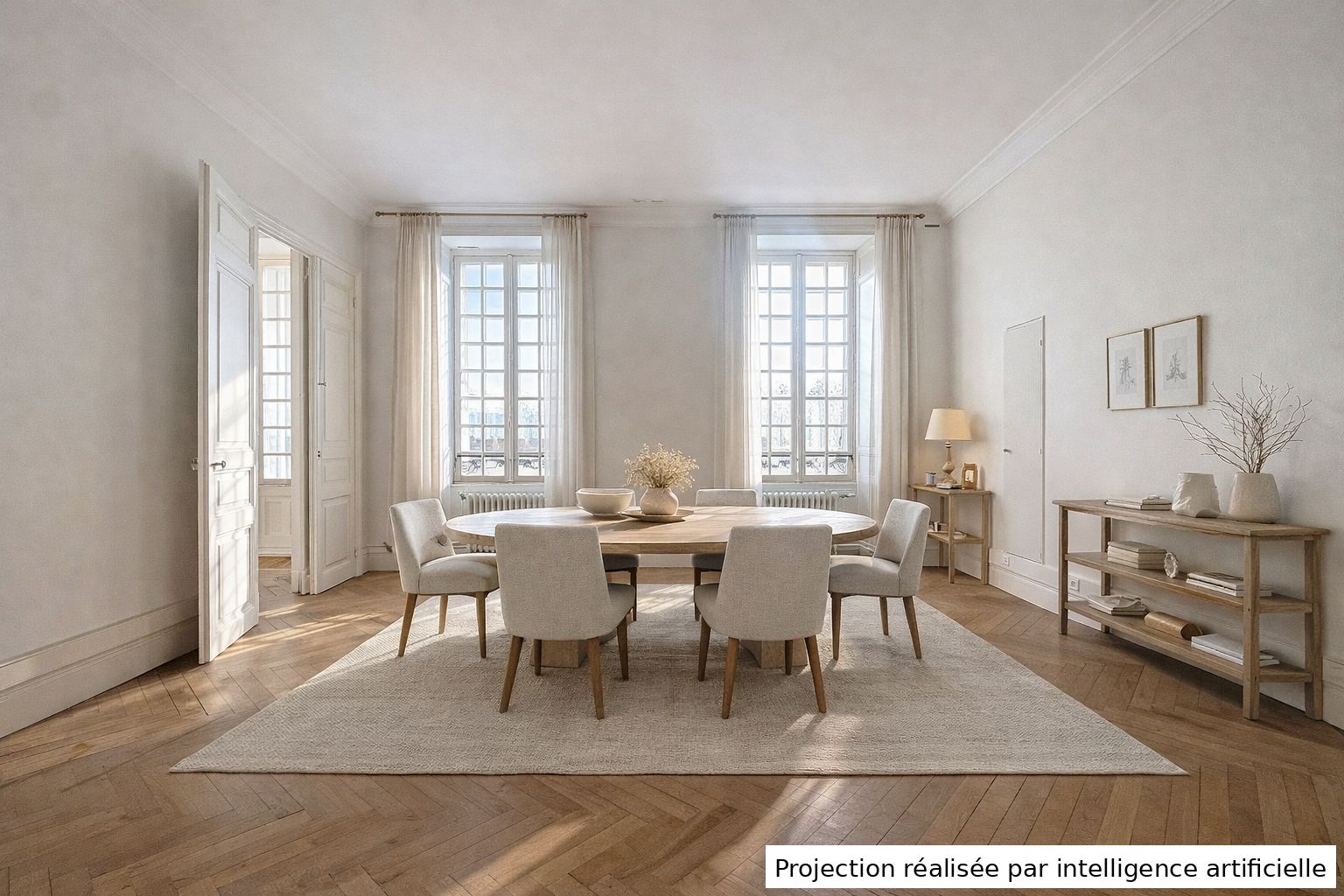 Dès l’entrée, les codes de l’architecture bourgeoise sont affirmés : hauteur sous plafond exceptionnelle, parquet en chevron, moulures, cheminée, volumes élégants et proportions harmonieuses. Le séjour profite pleinement de la lumière et s’ouvre sur un balcon, véritable prolongement vers le bassin.
