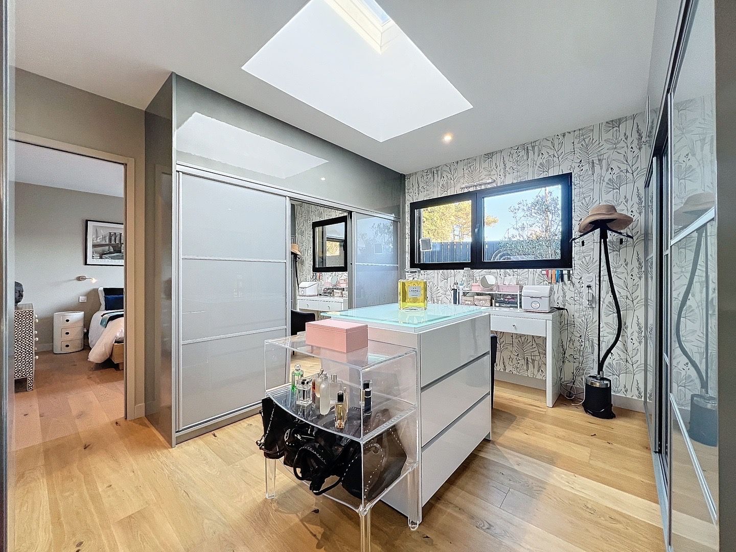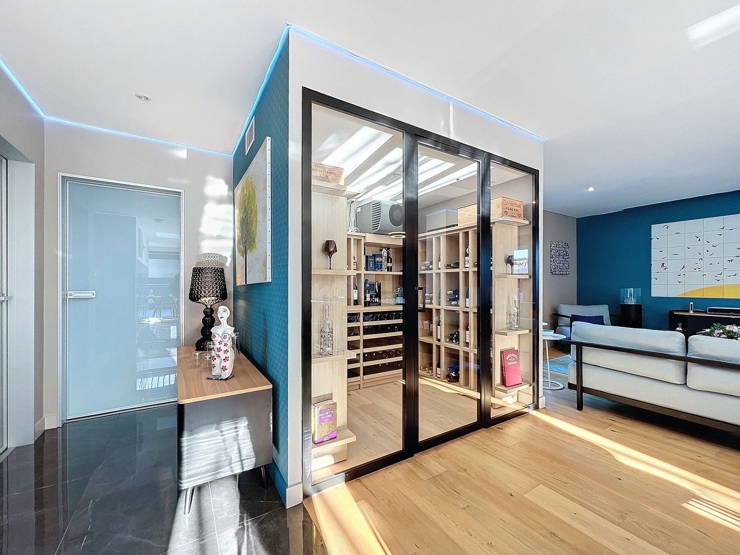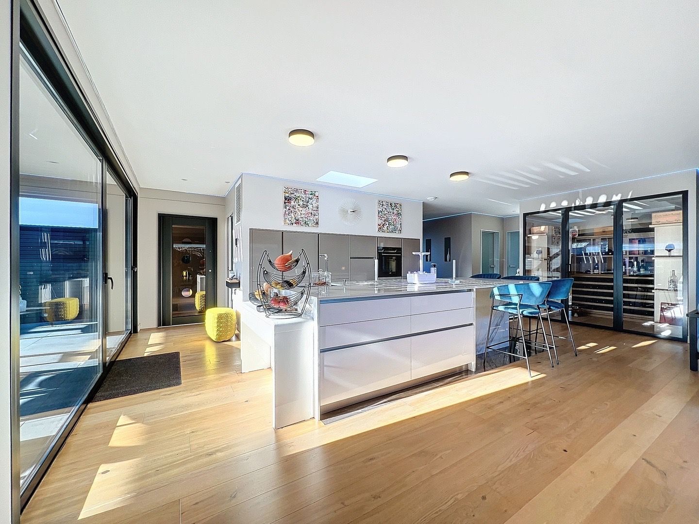 Au rez-de-chaussée, un ascenseur vous mène directement à un grand garage pouvant accueillir plusieurs véhicules, ainsi qu’à un espace bureau aménageable selon vos besoins.