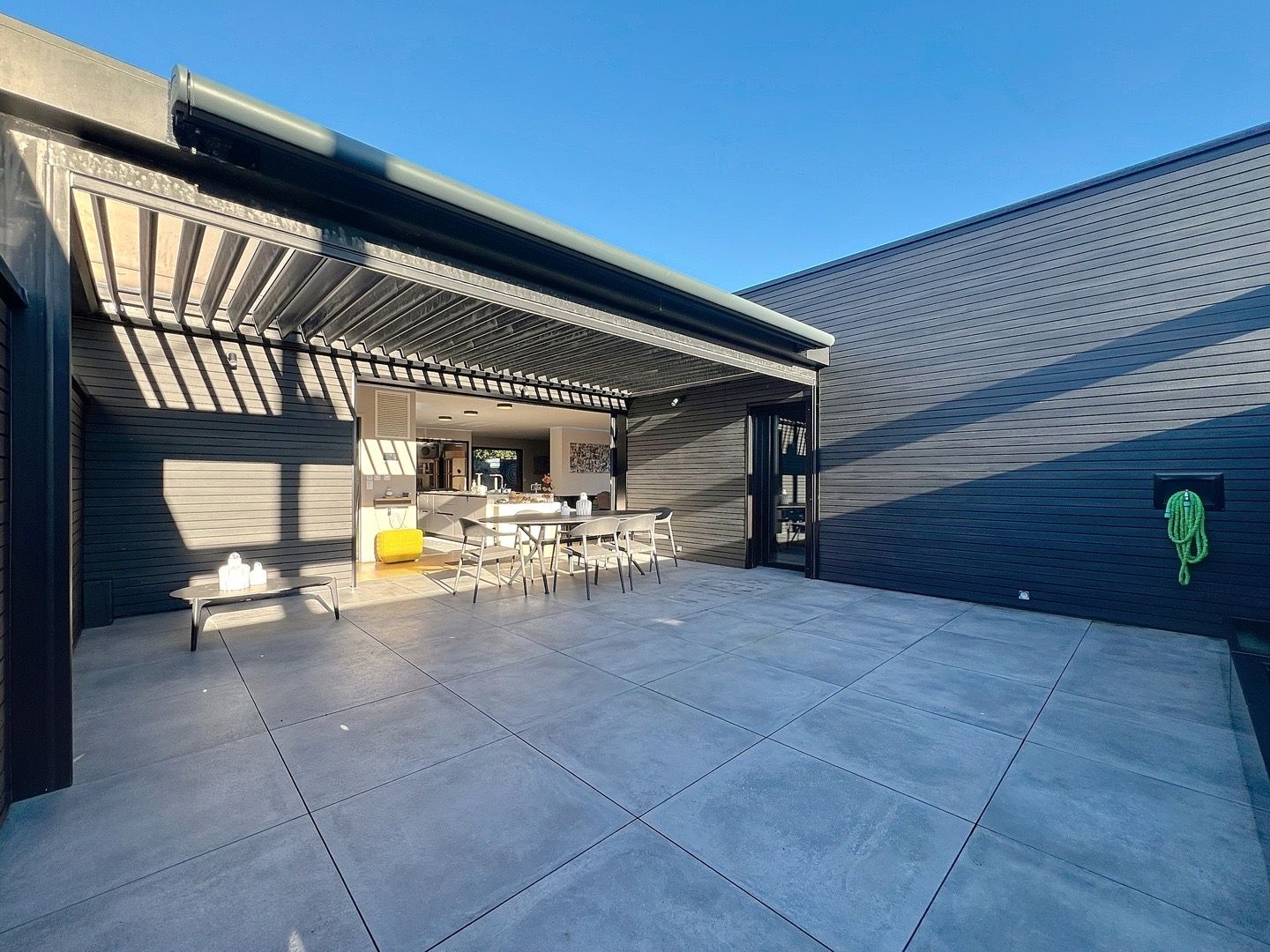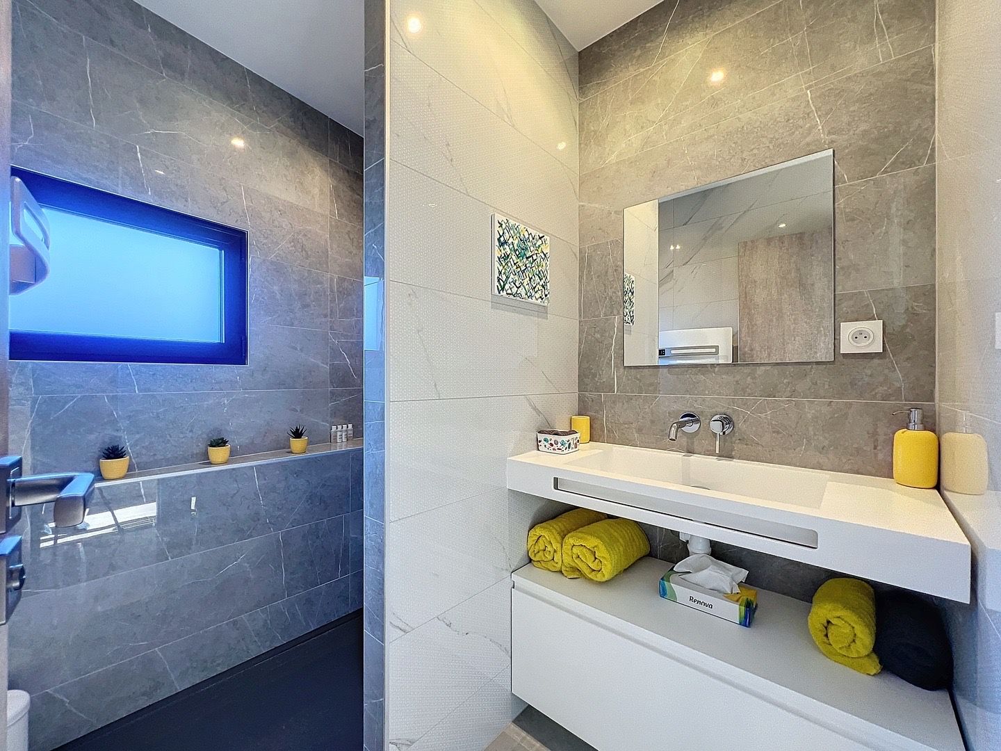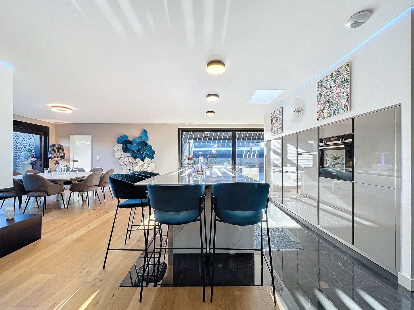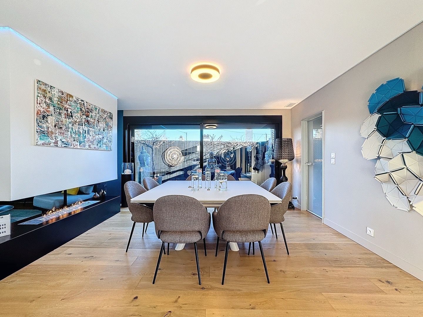 Au rez-de-chaussée, un ascenseur vous mène directement à un grand garage pouvant accueillir plusieurs véhicules, ainsi qu’à un espace bureau aménageable selon vos besoins.