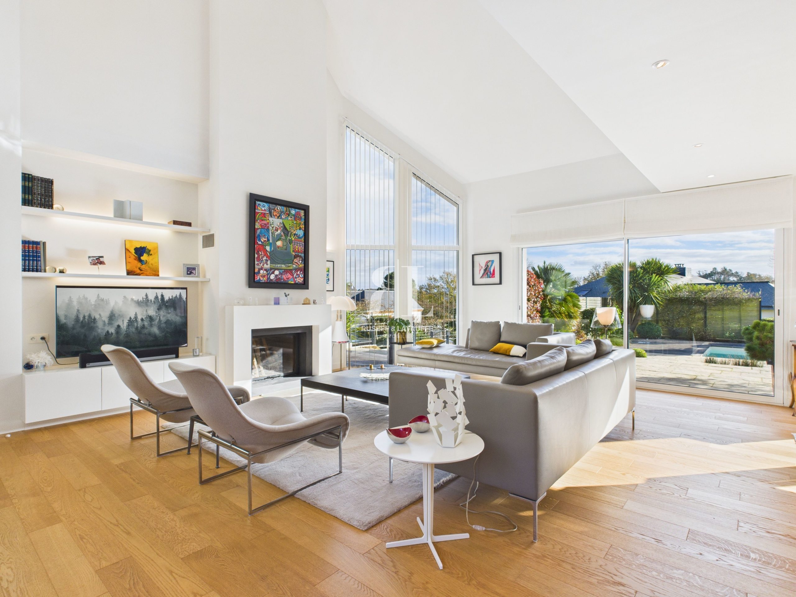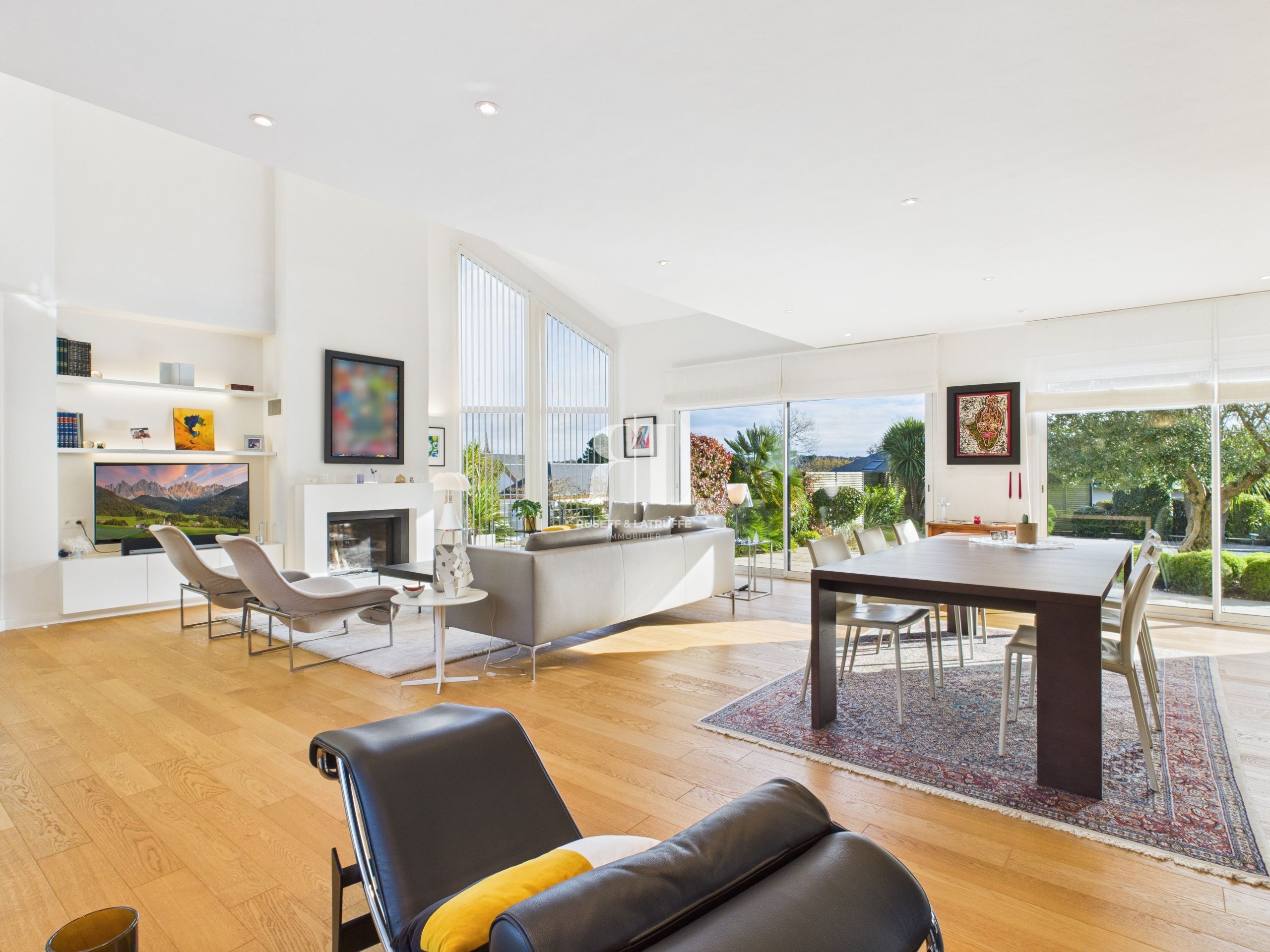 Dès l’entrée, la pièce de vie impressionne par ses volumes, sa cheminée contemporaine et ses larges ouvertures qui baignent l’ensemble de lumière. L’espace se prolonge naturellement vers la terrasse bien exposée et le jardin paysager, offrant une continuité parfaite entre intérieur et extérieur.