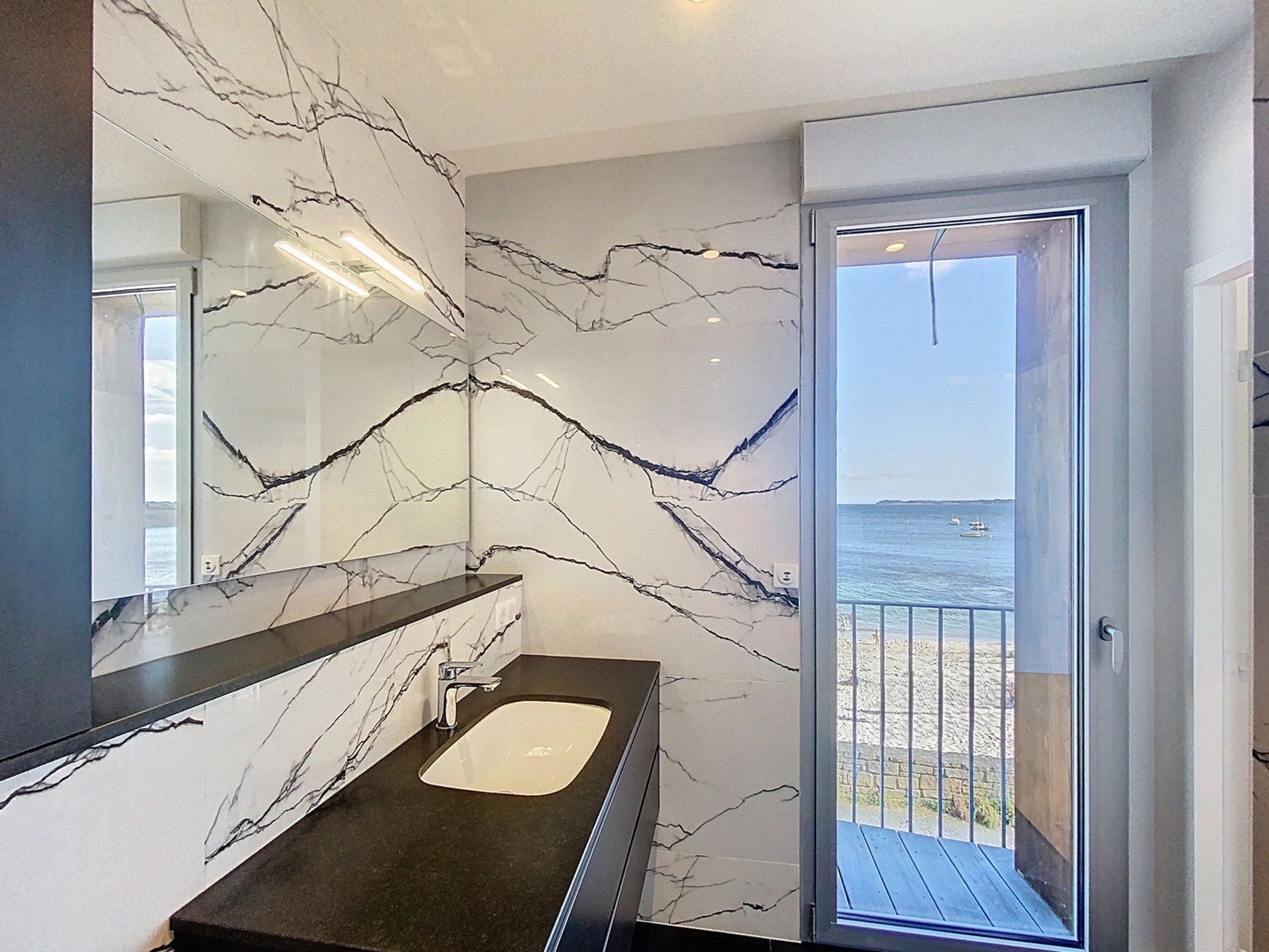 LOMENER – Face à l’océan, au cœur du charmant port de pêche de Lomener, cette maison entièrement rénovée vous offre un cadre de vie unique avec vue mer saisissante sur l’océan et l’île de Groix. Cette propriété offre des prestations contemporaines de très haut niveau. Chaque chambre dispose de sa propre salle d’eau et de son WC.