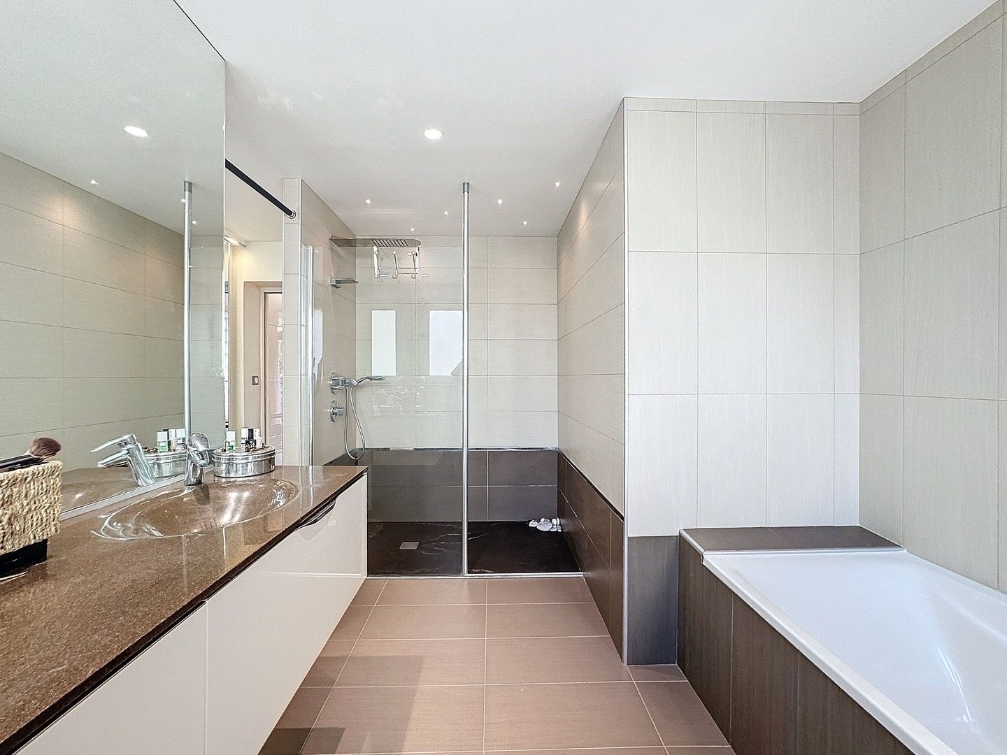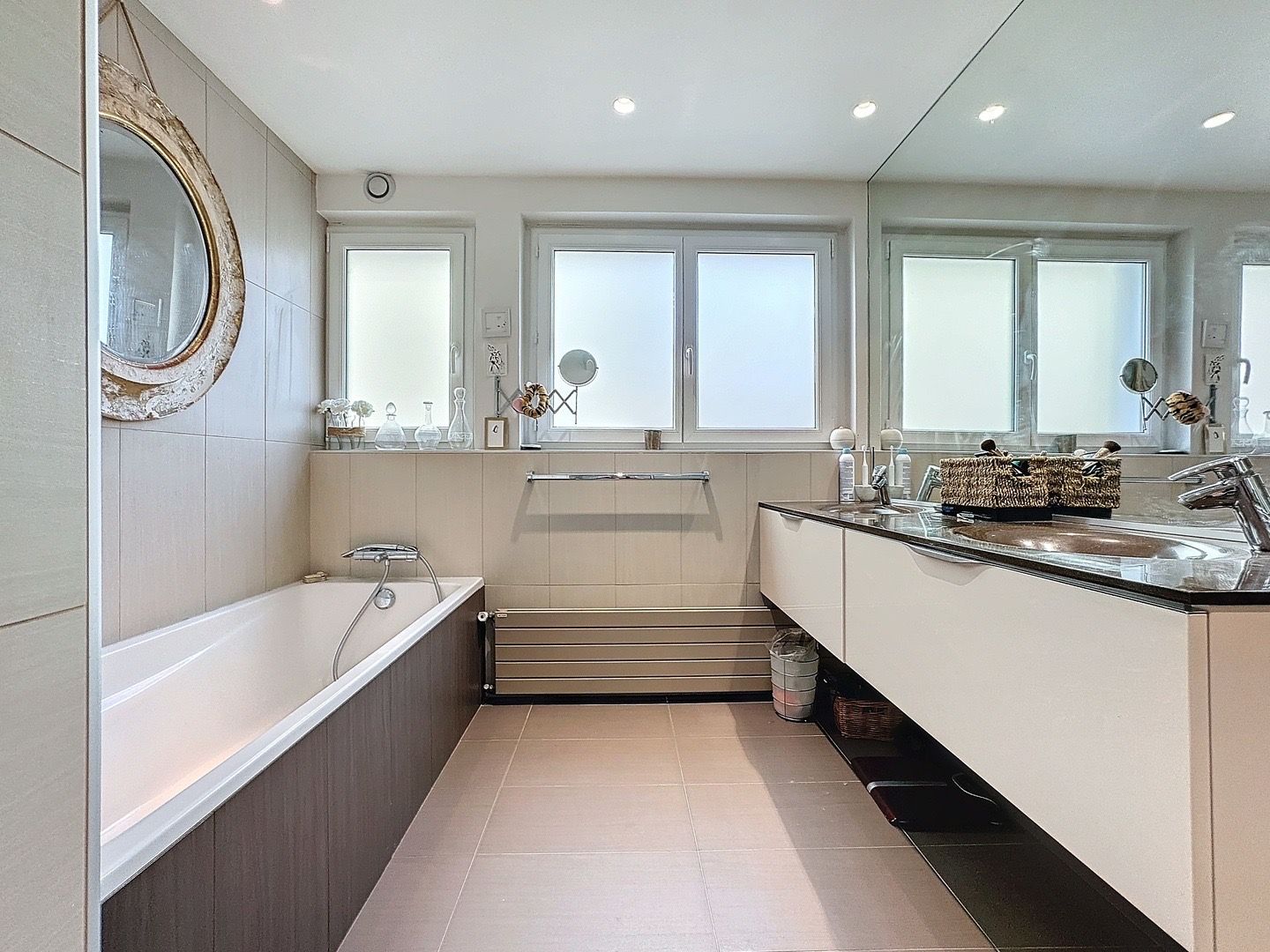 Premier niveau : Très grand salon séjour, cheminée, avec baies vitrées , d’où on accède à une grande terrasse couverte qui surplombe le jardin, desservi par une escalier contemporain en métal.Une grande cuisine aménagée et équipée, très bien agencée, un wc séparé, une suite parentale avec accès à la terrasse, grand dressing, salle de bains avec douche et baignoire, coin bureau.