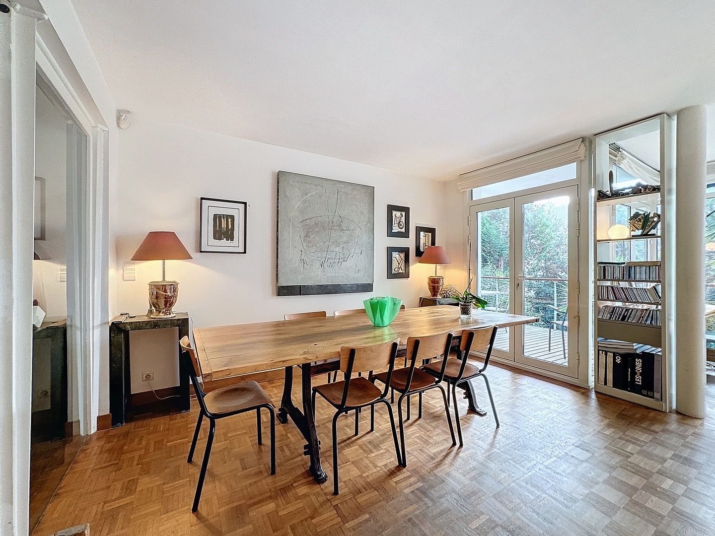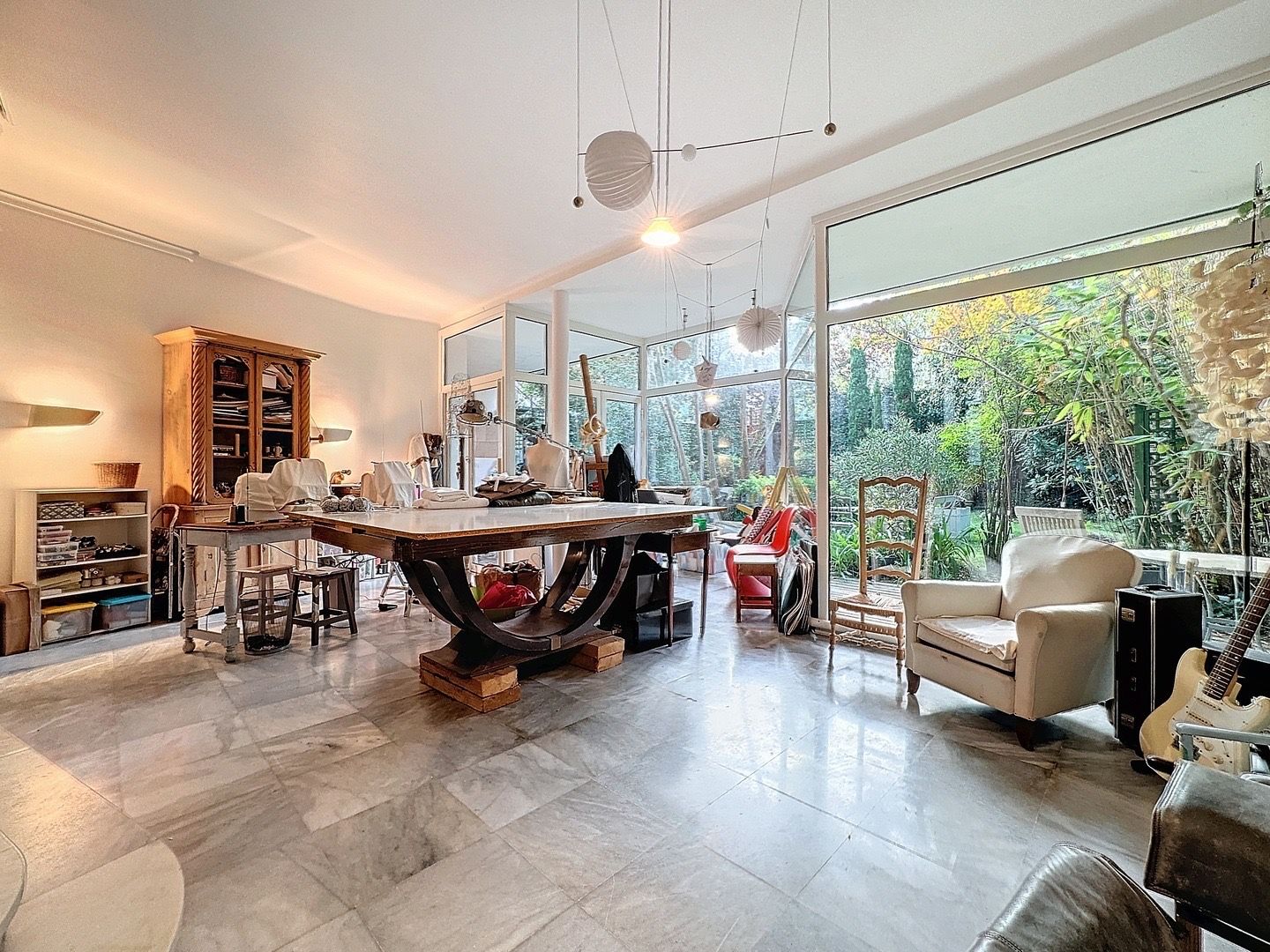 Rez-de-chaussée : On y découvre une entrée avec vestiaire, une vaste pièce de vie-détente , musique, atelier, entièrement vitrée avec cheminée et un bureau accèdant directement au jardin. Une grande buanderie et un wc, une chaufferie et deux garages.