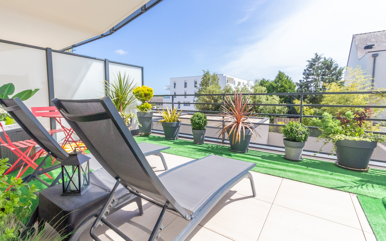 PLOEMEUR – EN EXCLUSIVITE, Hyper centre ville très bel appartement récent comprenant vaste salon séjour avec cuisine équipée et aménagée, salle d’eau, 2 chambres avec placard, cellier, grande terrasse exposée sud (17m2), parking privé….