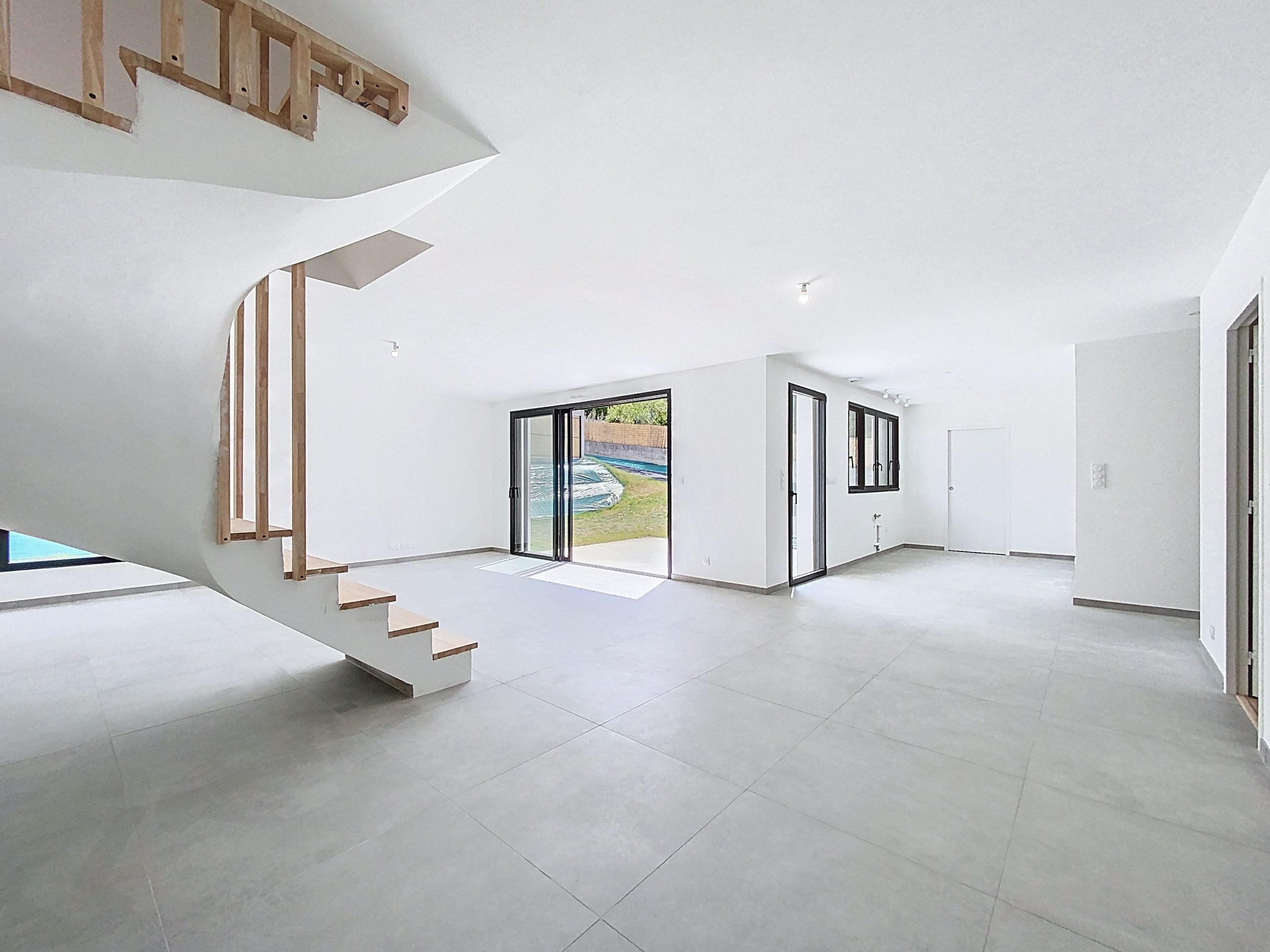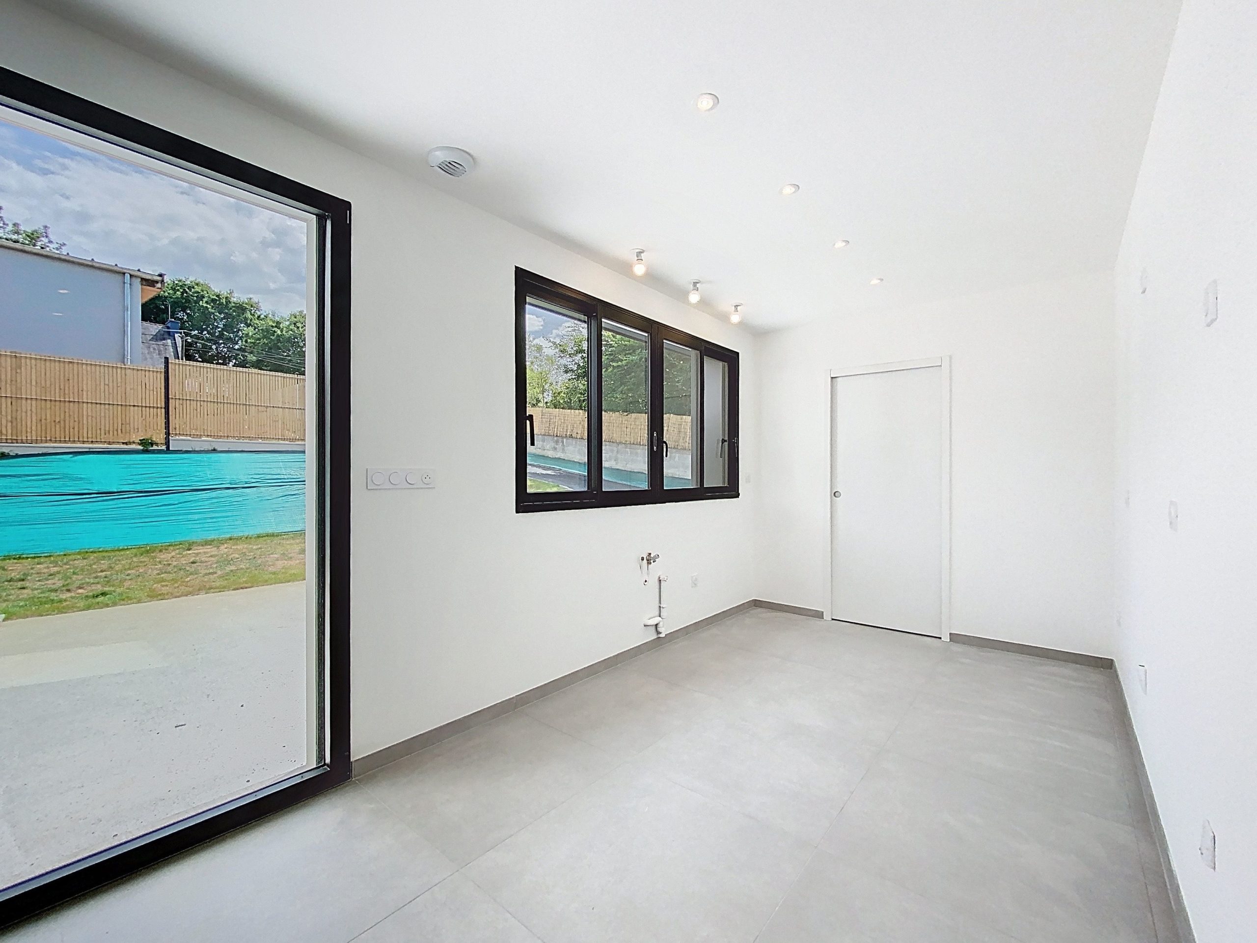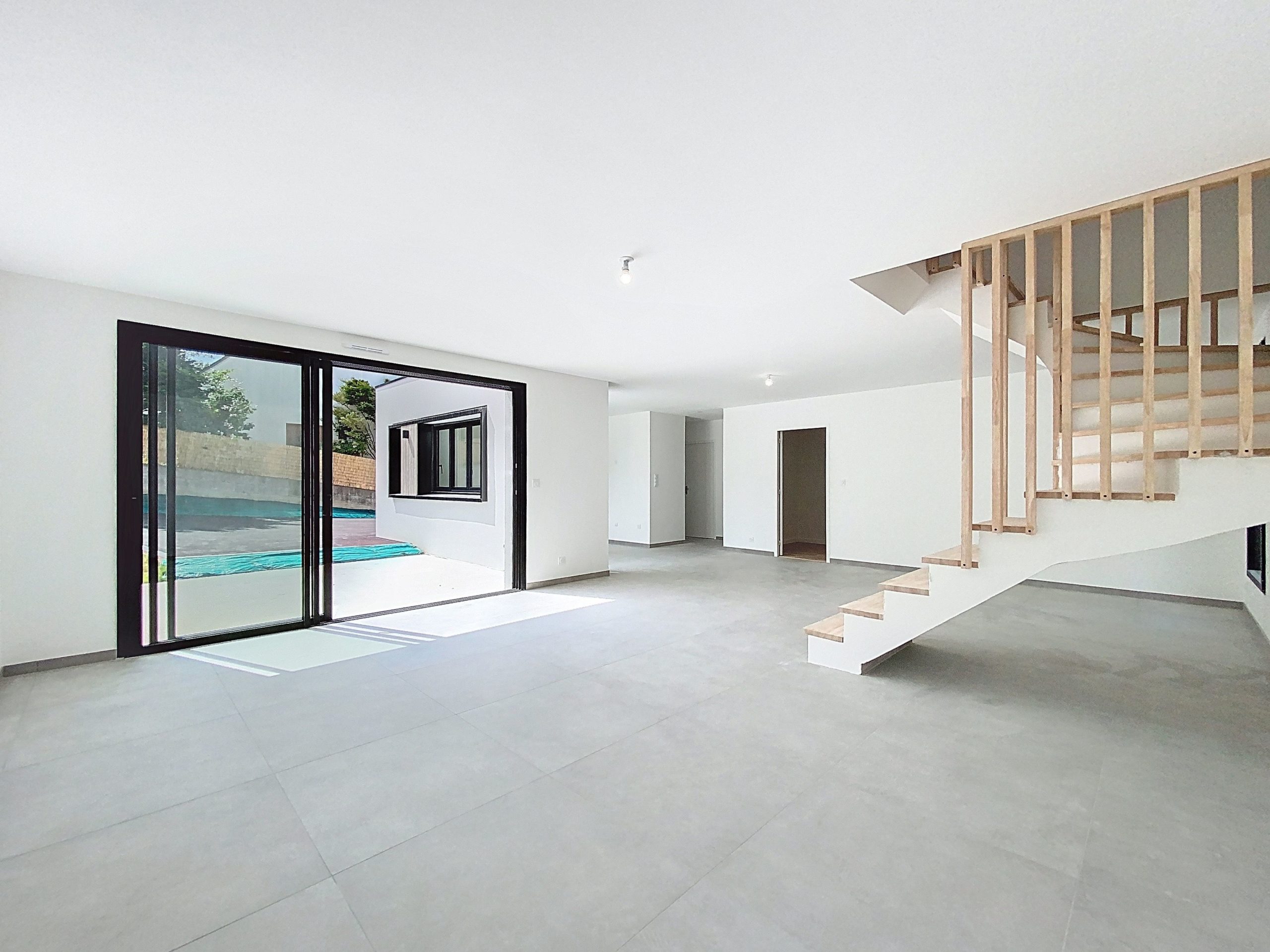 Dès l’entrée, un vaste hall donne le ton : lignes sobres, matériaux qualitatifs et clarté omniprésente. Le séjour de 47 m², baigné de lumière naturelle grâce à de larges ouvertures, s’ouvre sur une belle terrasse ensoleillée, promesse de moments privilégiés. L’espace cuisine, encore à imaginer selon vos envies, prolonge cette pièce de vie avec élégance. Un cellier attenant assure une fonctionnalité discrète au quotidien.