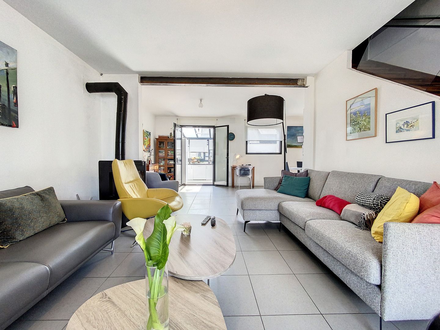 Le premier niveau dévoile une belle pièce de vie lumineuse avec poêle, une cuisine aménagée et équipée, ainsi qu’une suite parentale avec salle d’eau.