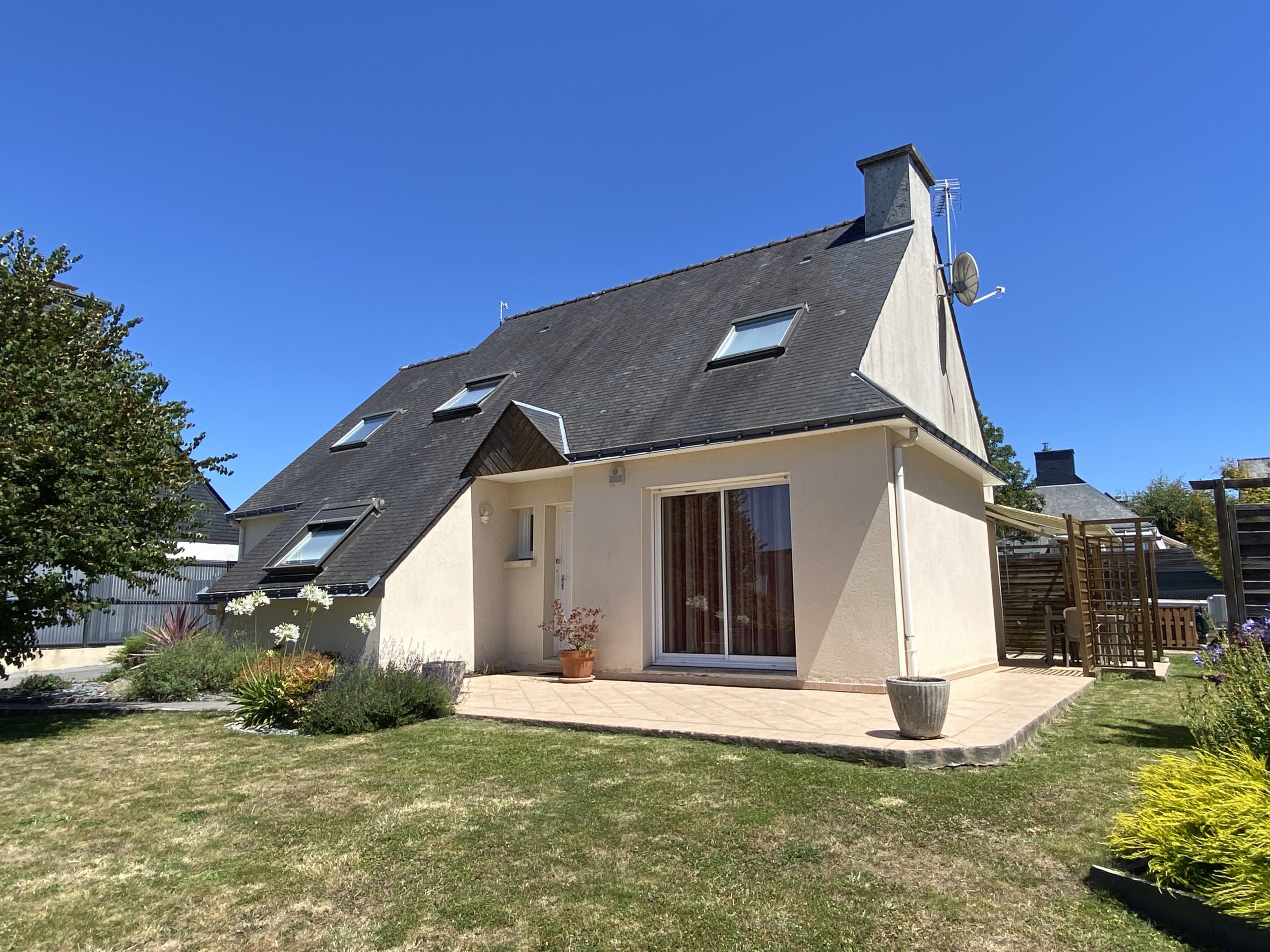 PLOEMEUR – EN EXCLUSIVITE, à deux pas du centre, dans un quartier recherché, agréable maison lumineuse comprenant entrée sur salon séjour, cuisine équipée et aménagée, chambre, salle d’eau, à l’étage 3 chambres, bureau, salle de bains, garage, abris de jardin, terrasse.