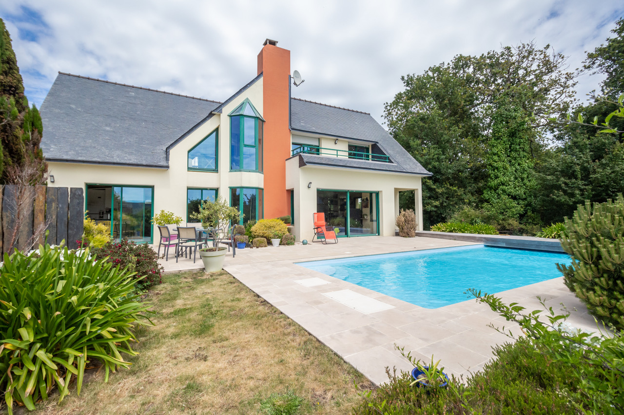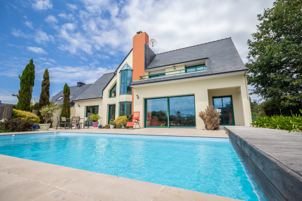 PLOEMEUR – MAISON FAMILIALE de 225 m2; comprenant une entrée, un salon-séjour avec cheminée, une cuisine équipée et aménagée, un bureau, une suite parentale avec salle de bains et WC, un placard. A l’étage un dégagement, une salle de jeux ainsi que quatre chambres, une salle de bains, une piscine et un double garage…