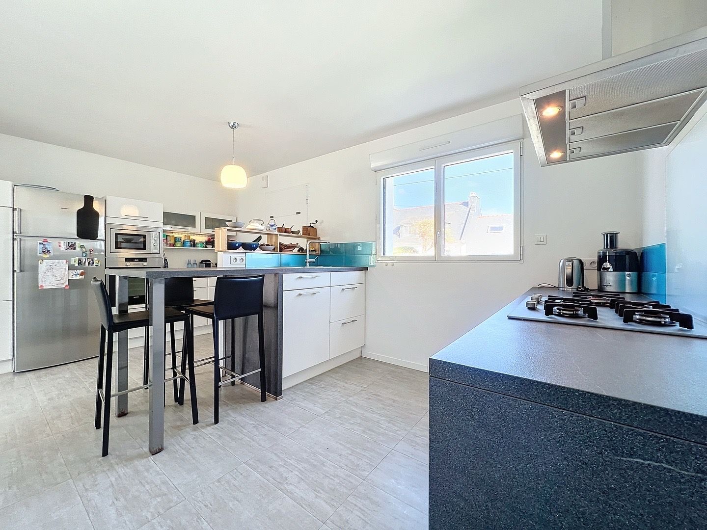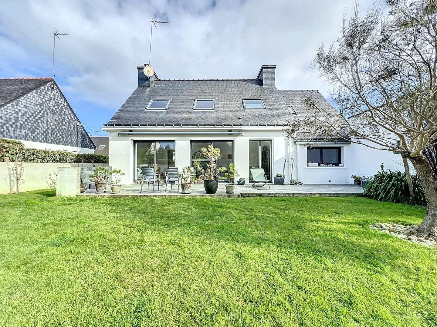 PLOEMEUR – FORT BLOQUE – Située au calme d’une impasse à seulement 200 m de la plage, cette maison entièrement rénovée avec une extension récente offre un cadre de vie agréable. La cuisine aménagée et équipée, le salon séjour très lumineux avec un poêle et un accès terrasse, le salon télévision (ou chambre), le bureau et la belle suite parentale offrent un espace confortable et moderne. A l’étage vous trouverez une mezzanine, deux belles chambres, une salle d’eau et un grenier (rangements). Un garage et une buanderie complètent ce bien. A découvrir !