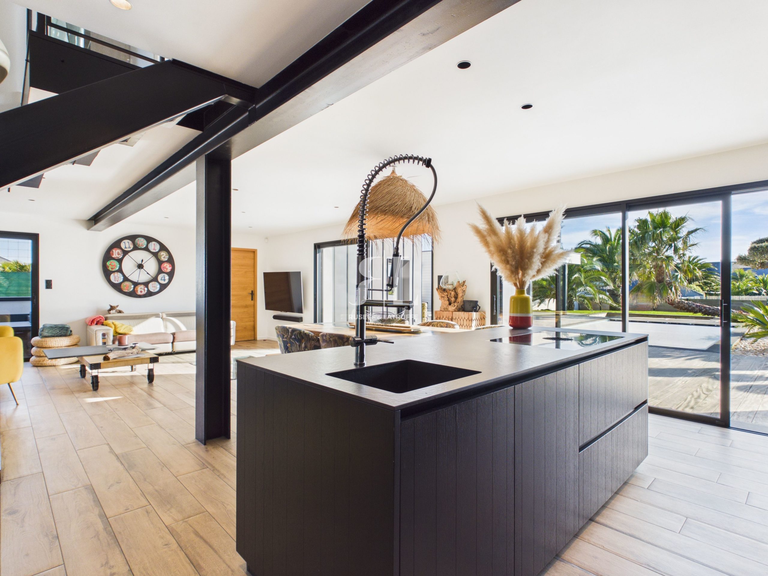 D’une surface habitable de 185 m², la maison se compose de cinq chambres, de trois salles de bain, d’une cuisine entièrement équipée, ainsi que d’espaces dédiés au bien-être comprenant un sauna et deux jacuzzis. Une piscine chauffée complète l’ensemble.