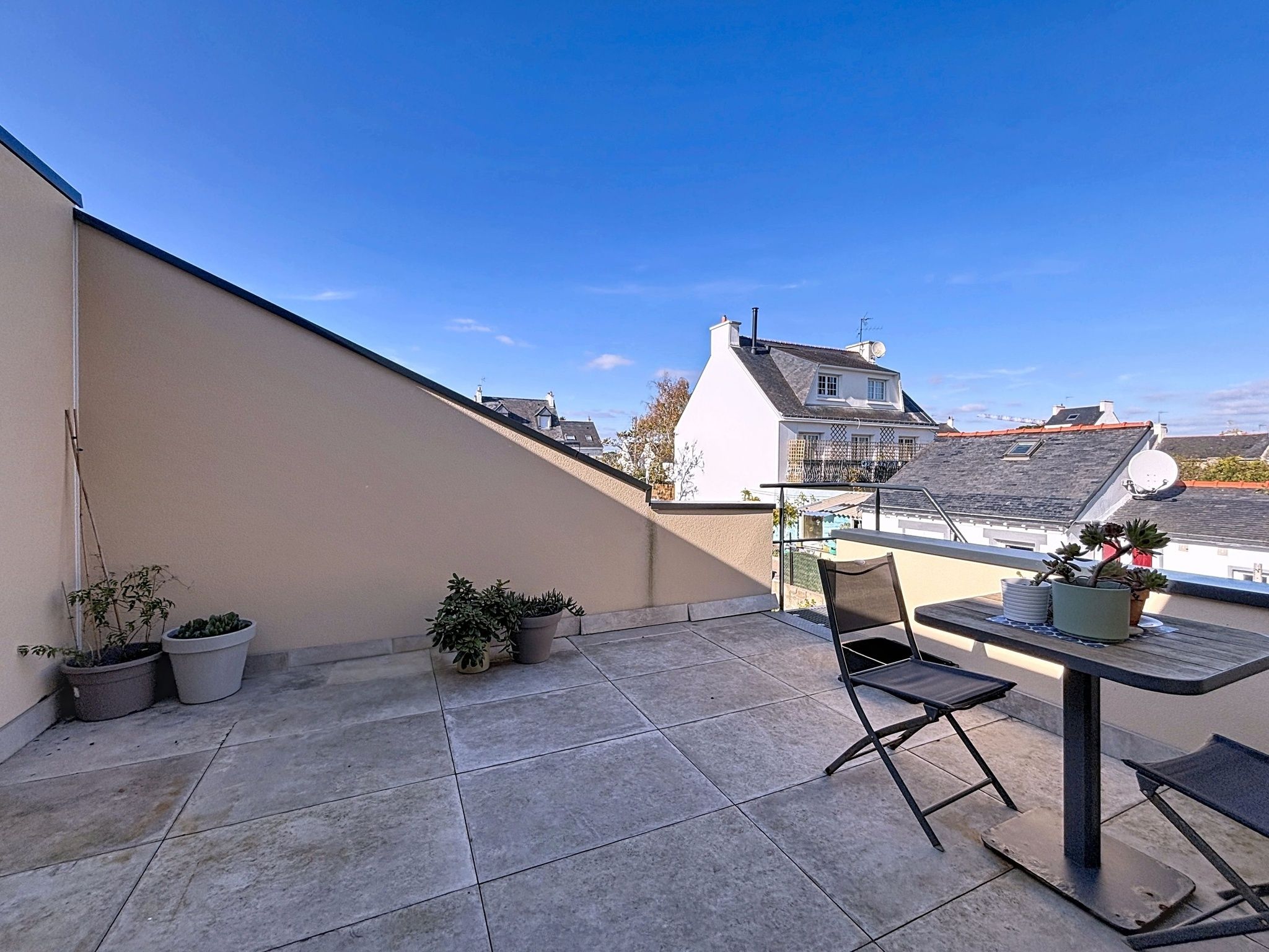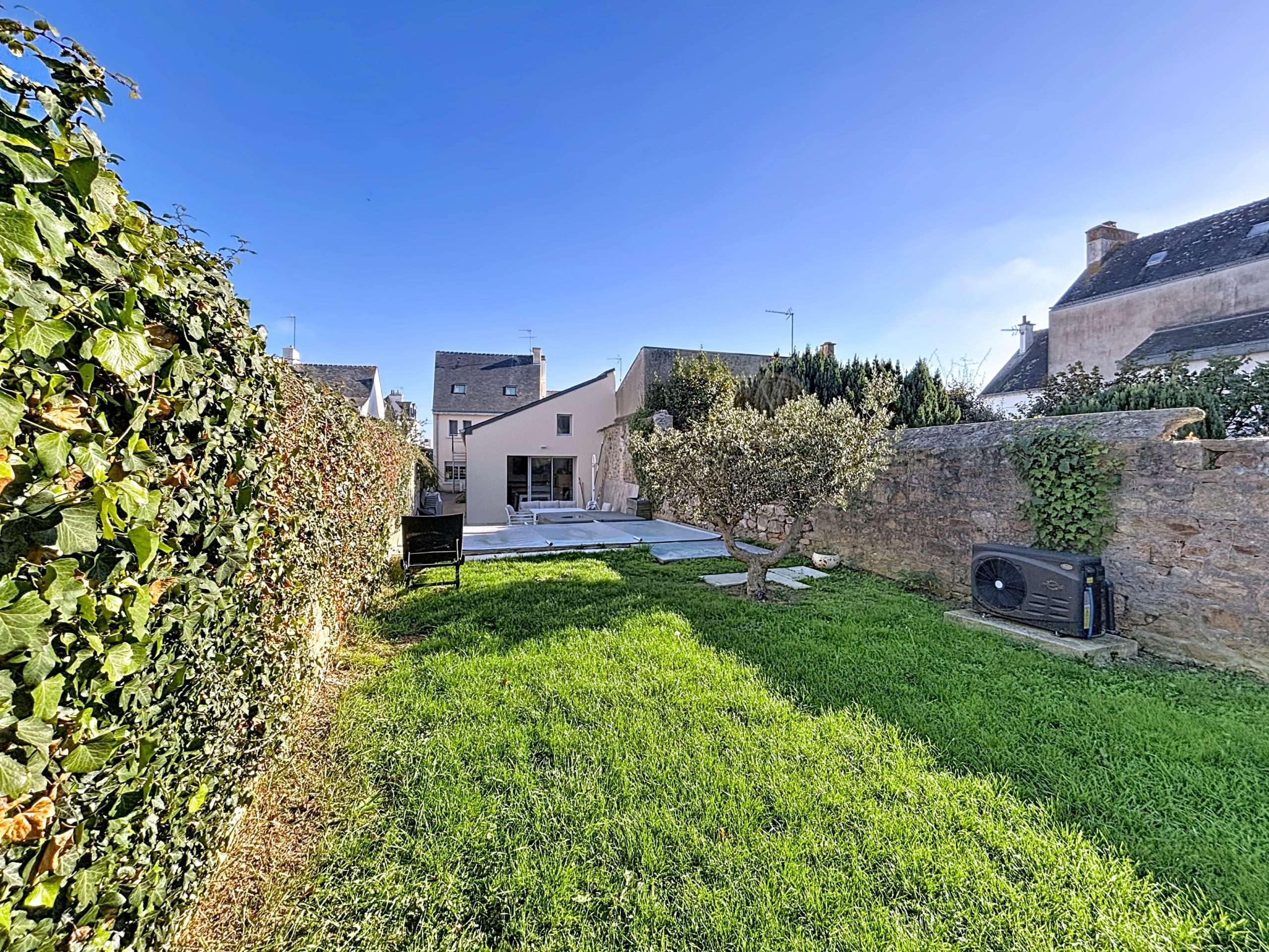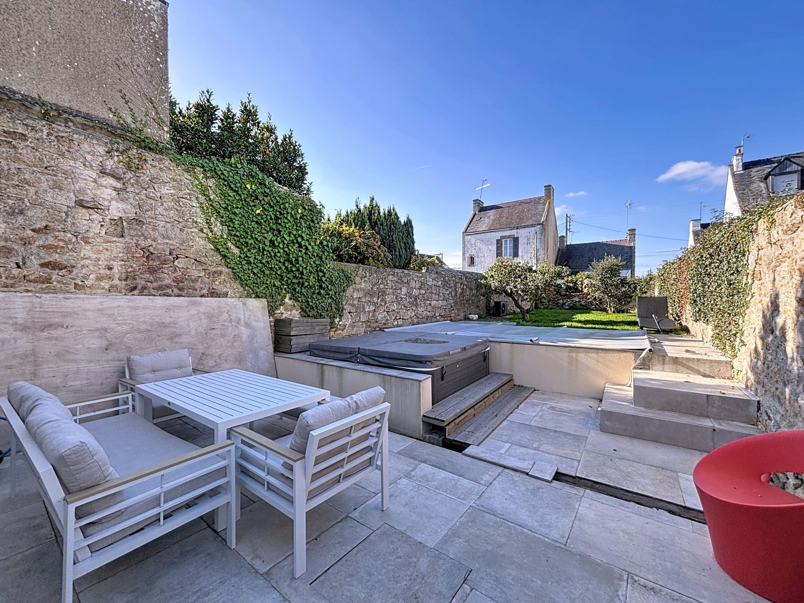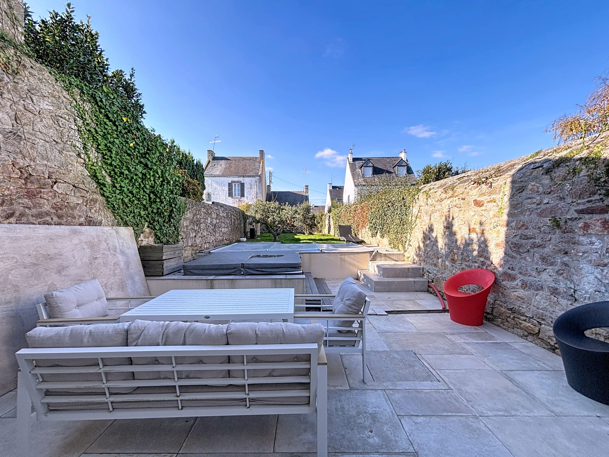 La maison principale s’élève sur trois niveaux : le rez-de-chaussée accueille un garage et deux chambres ; à l’étage, un salon-séjour orienté sud-est, baigné de lumière et offrant une jolie vue sur Locmalo, se prolonge par une cuisine moderne ouvrant sur une terrasse avec arrière-cuisine attenante. Enfin, le dernier niveau est entièrement dédié à une suite parentale, d’environ 40 m² au sol, avec salle de bains privative et bureau/dressing.