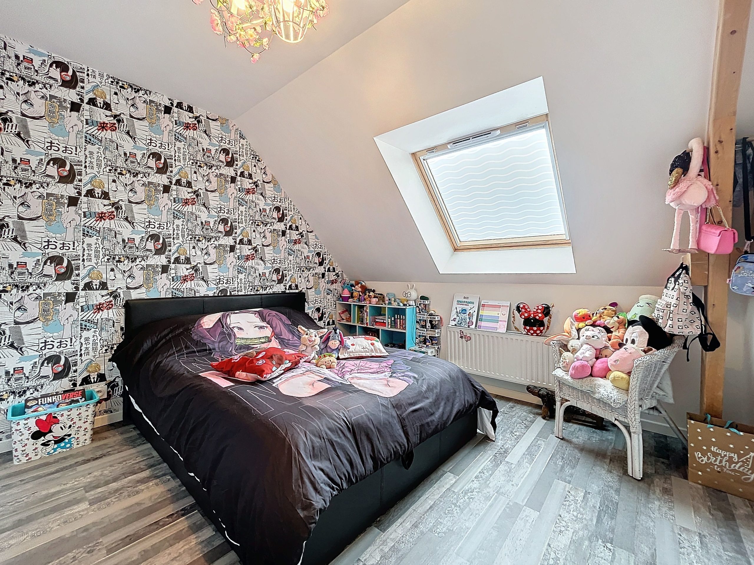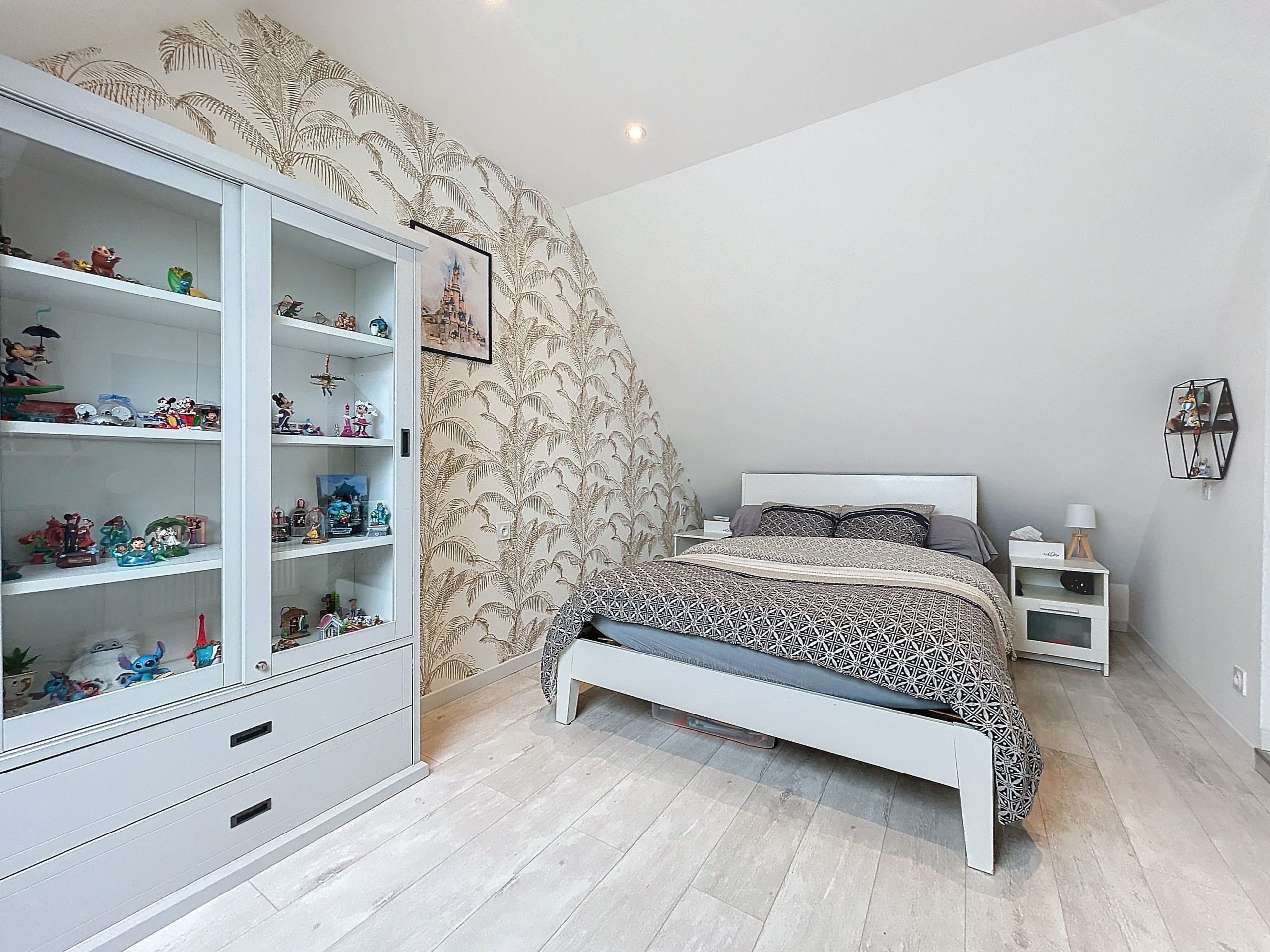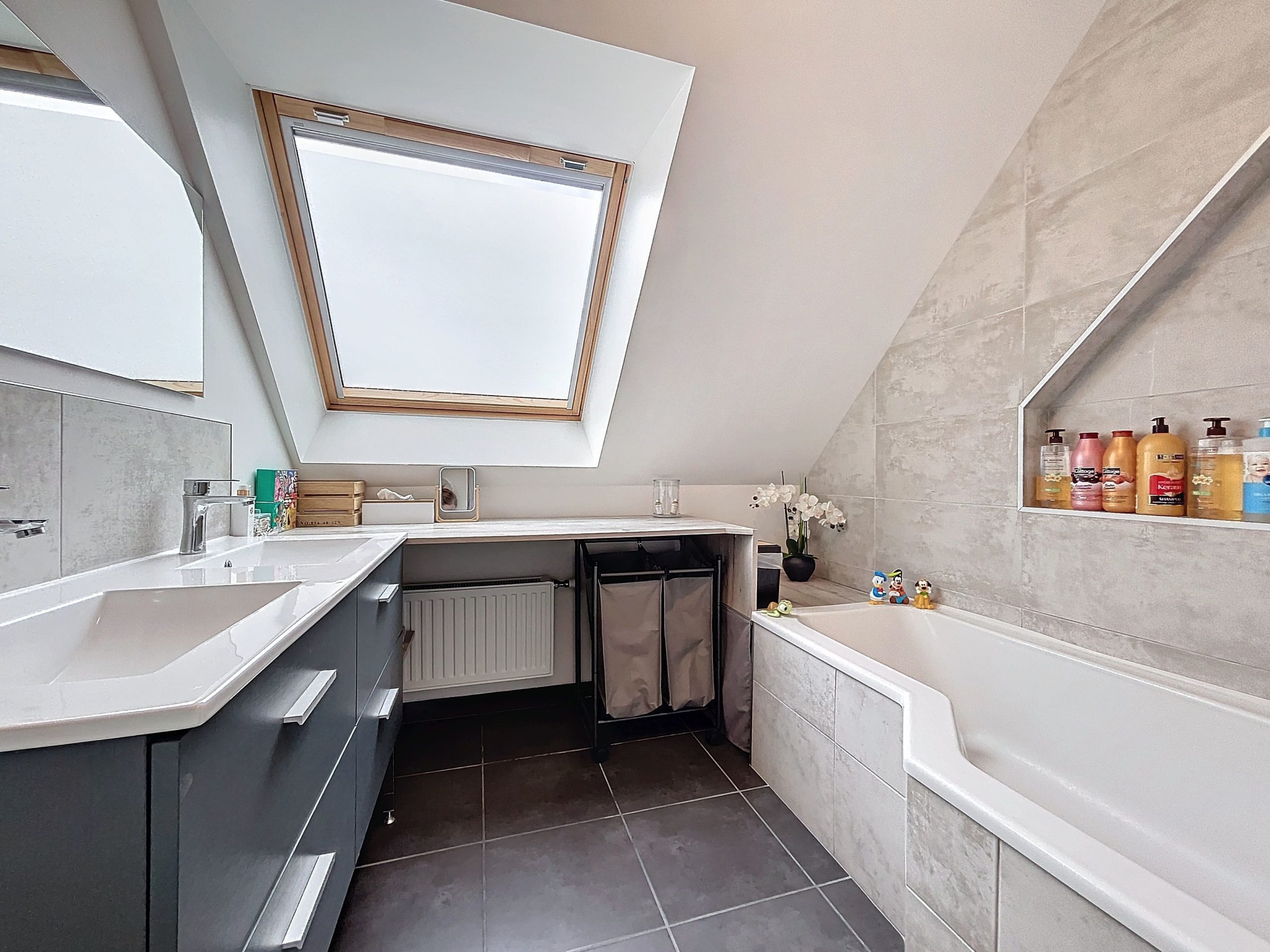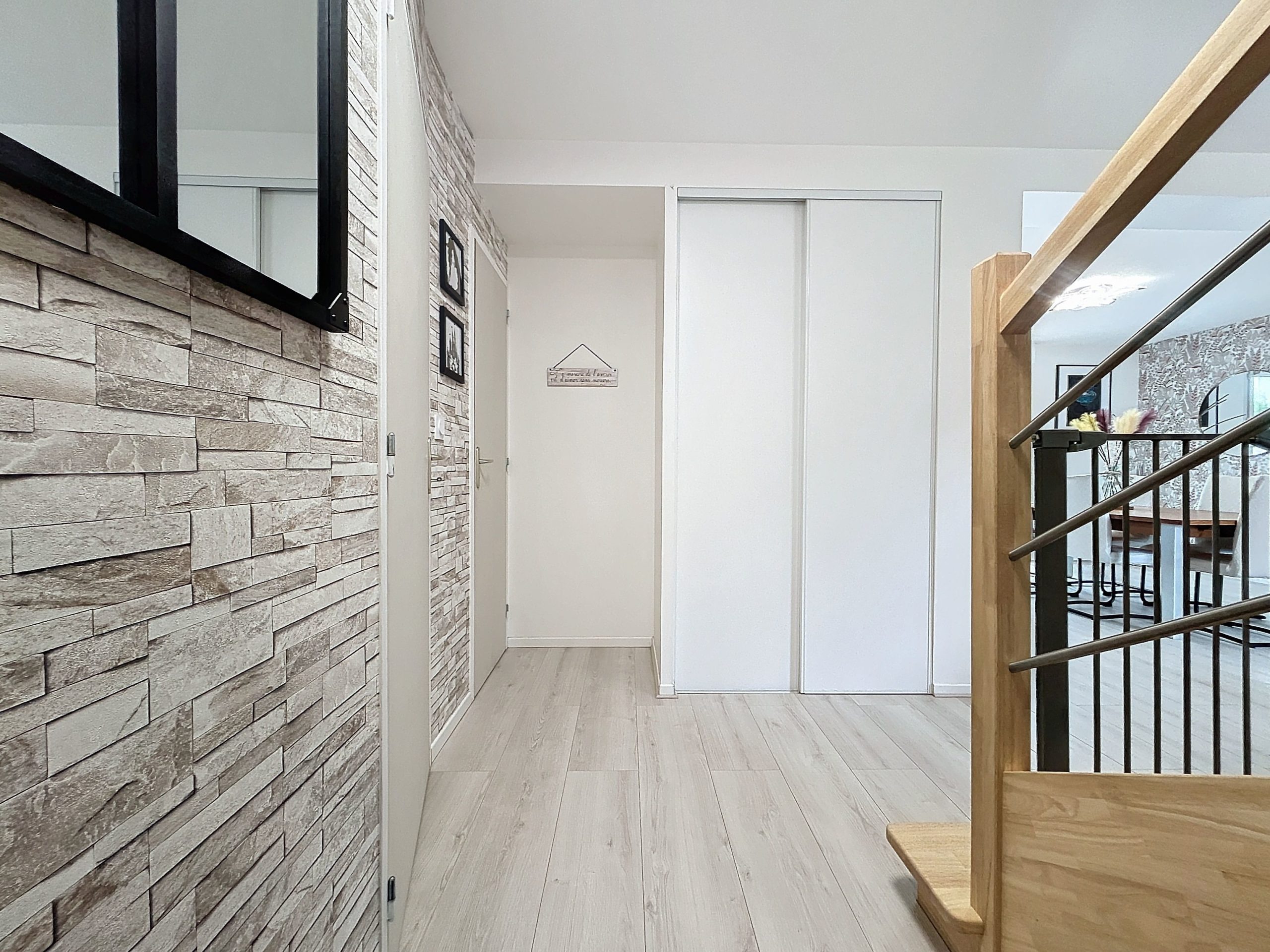 À l’étage, le palier dessert quatre chambres avec placards intégrés, une salle de bains et un WC séparé.