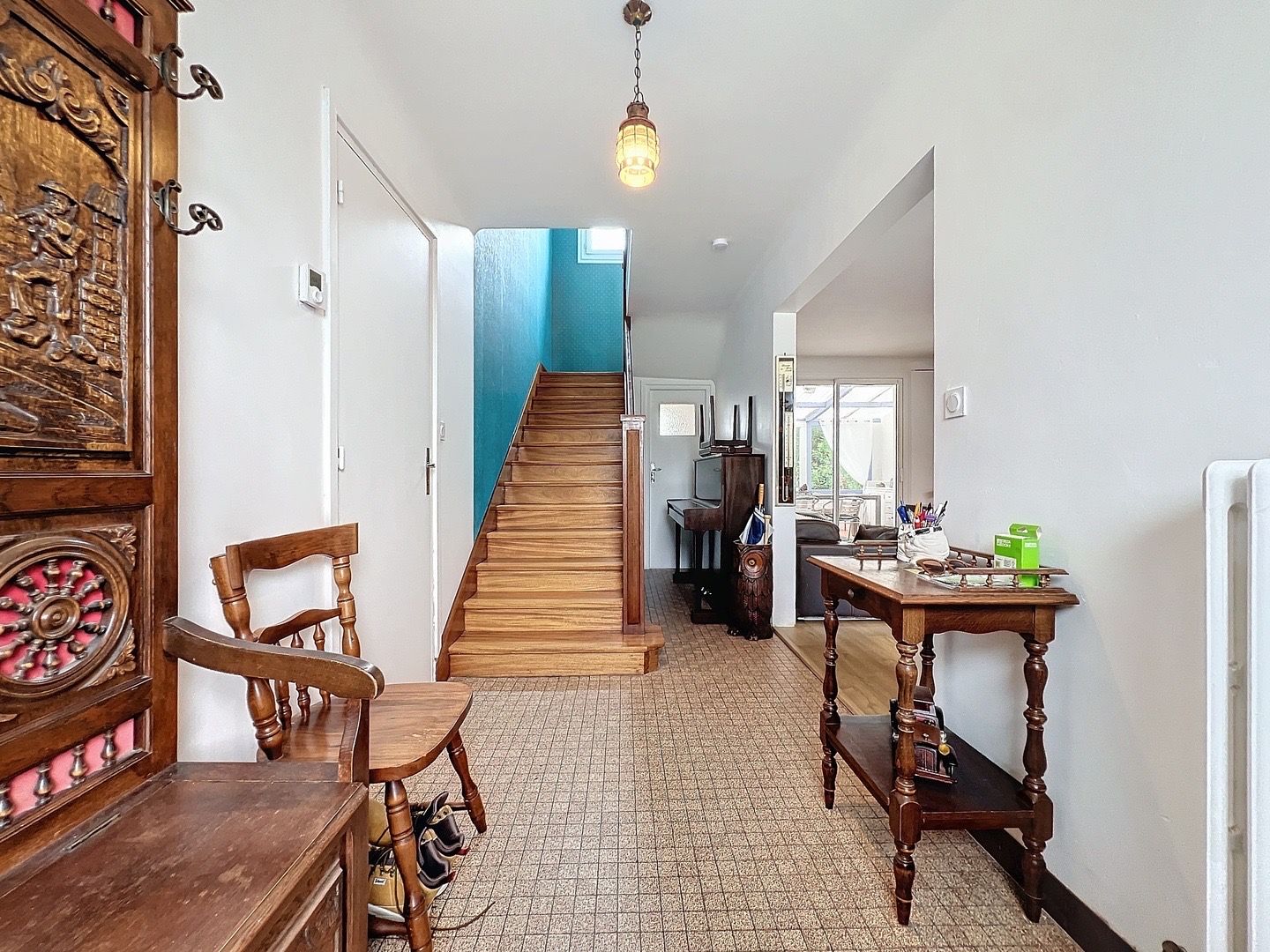 Au rez-de-chaussée, une entrée dessert une cuisine aménagée ouverte sur un séjour lumineux, prolongé par une véranda baignée de lumière.