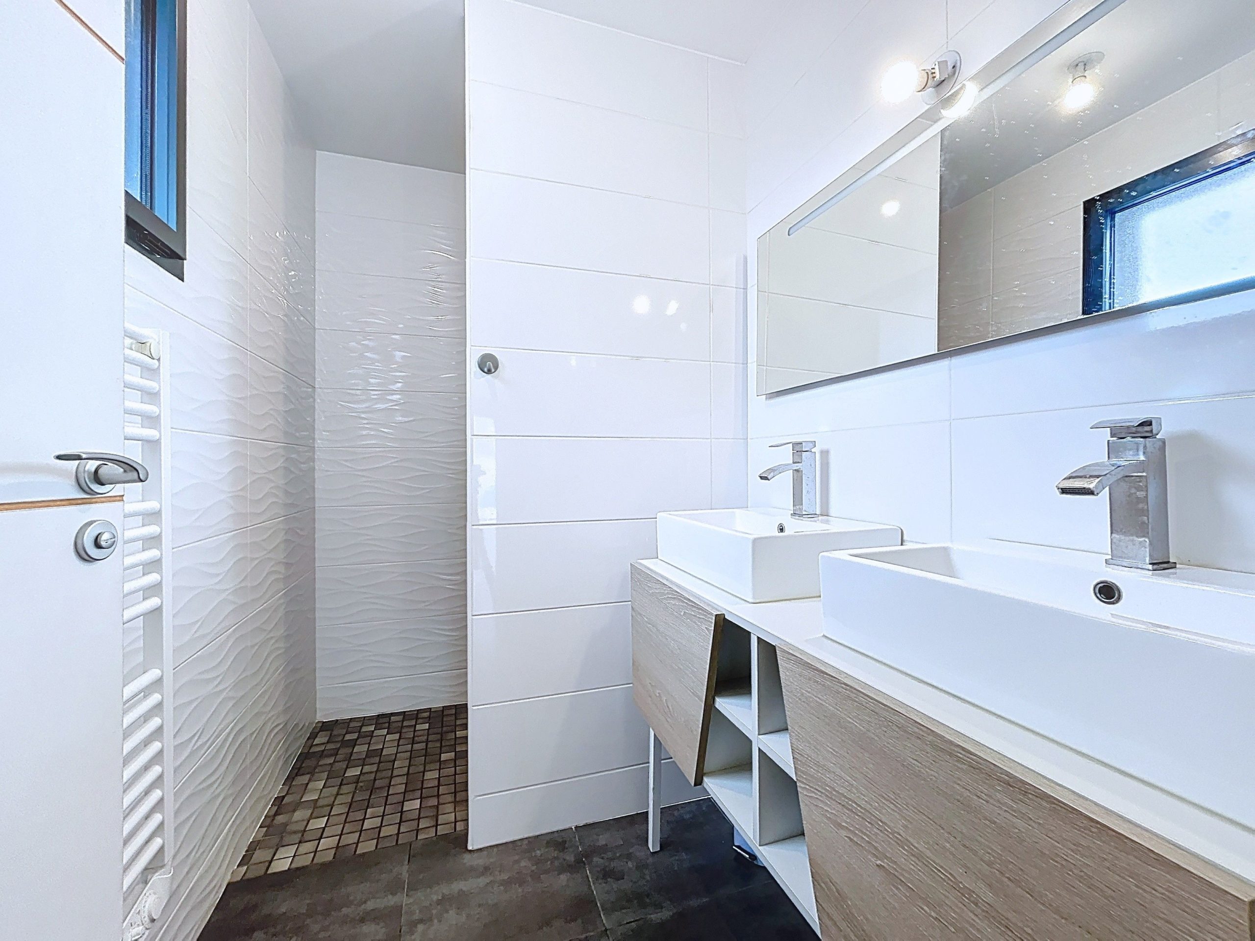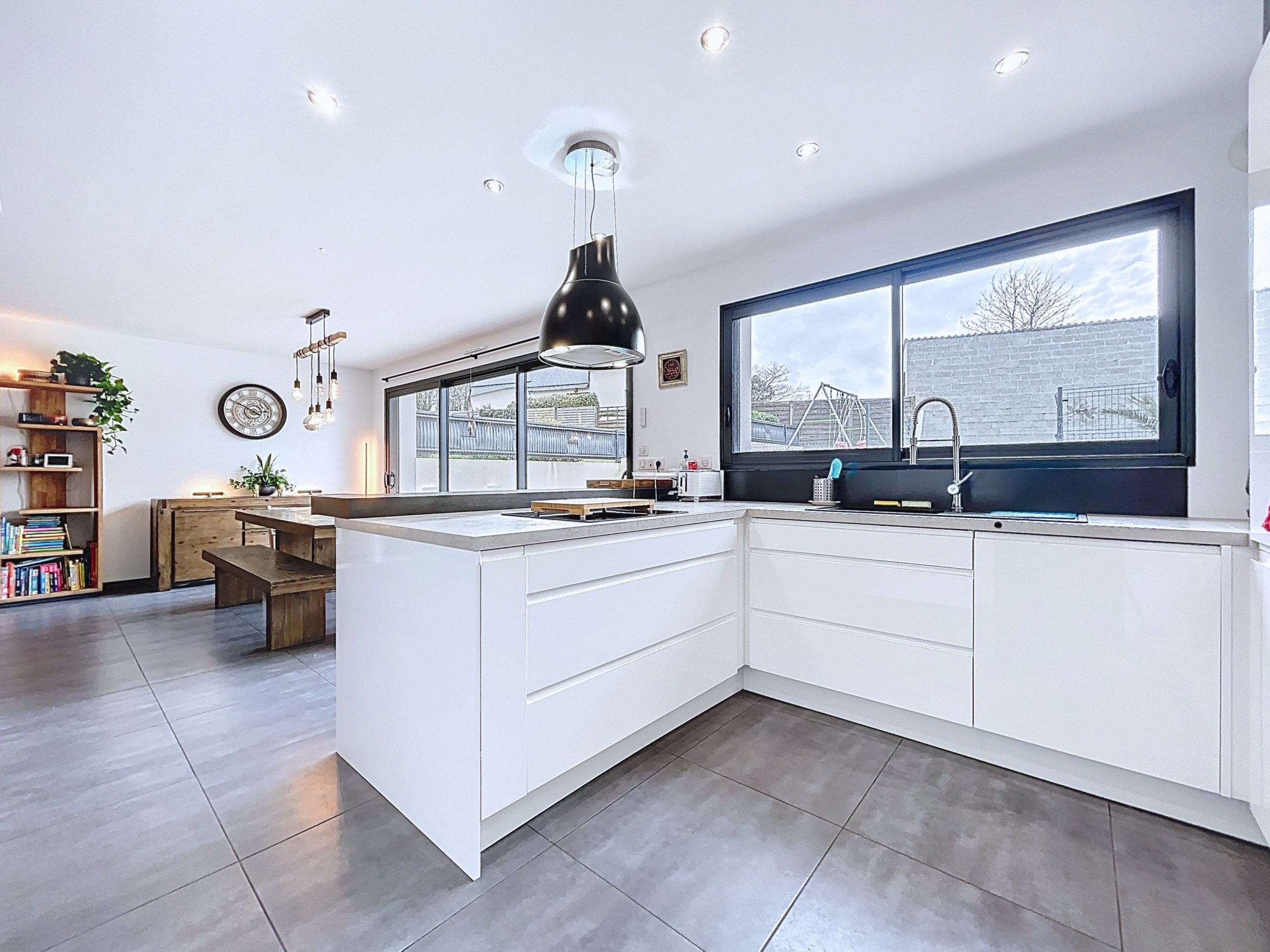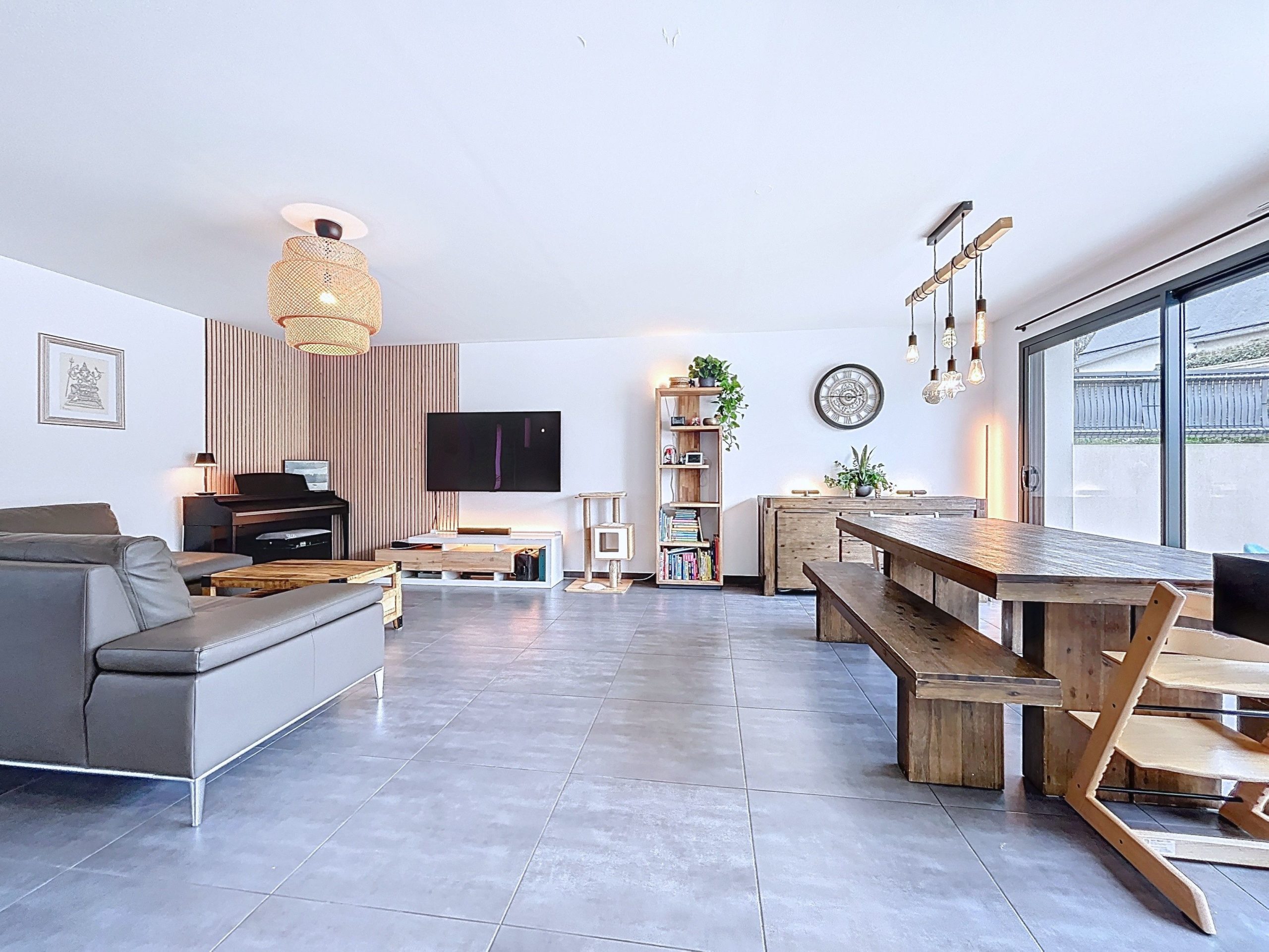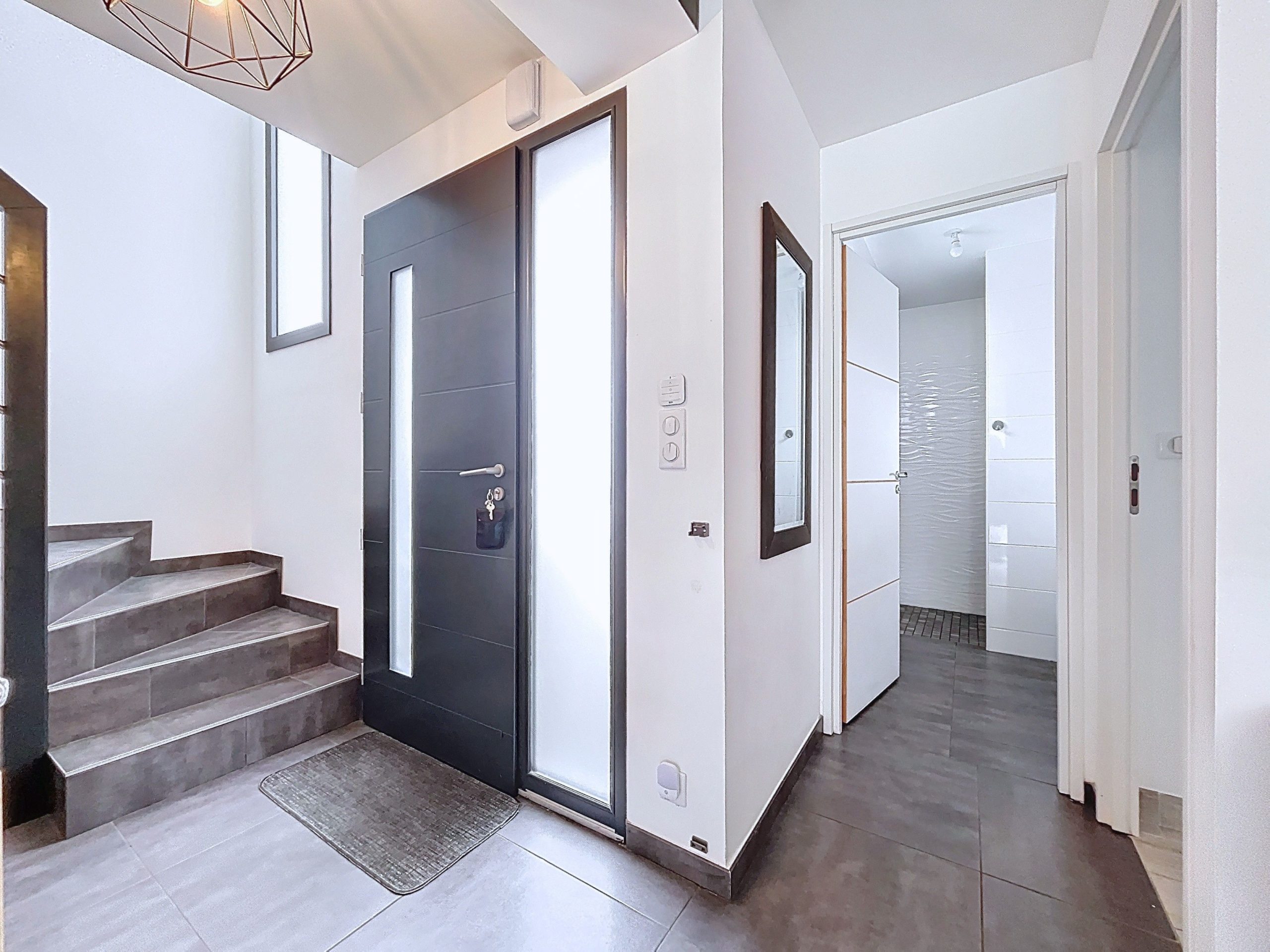 L’entrée avec rangements s’ouvre sur une grande pièce de vie lumineuse, tournée vers l’extérieur, avec un accès direct à une vaste terrasse carrelée exposée plein sud, sans vis-à-vis. La cuisine ouverte, moderne et bien pensée, s’intègre naturellement à l’espace de vie.