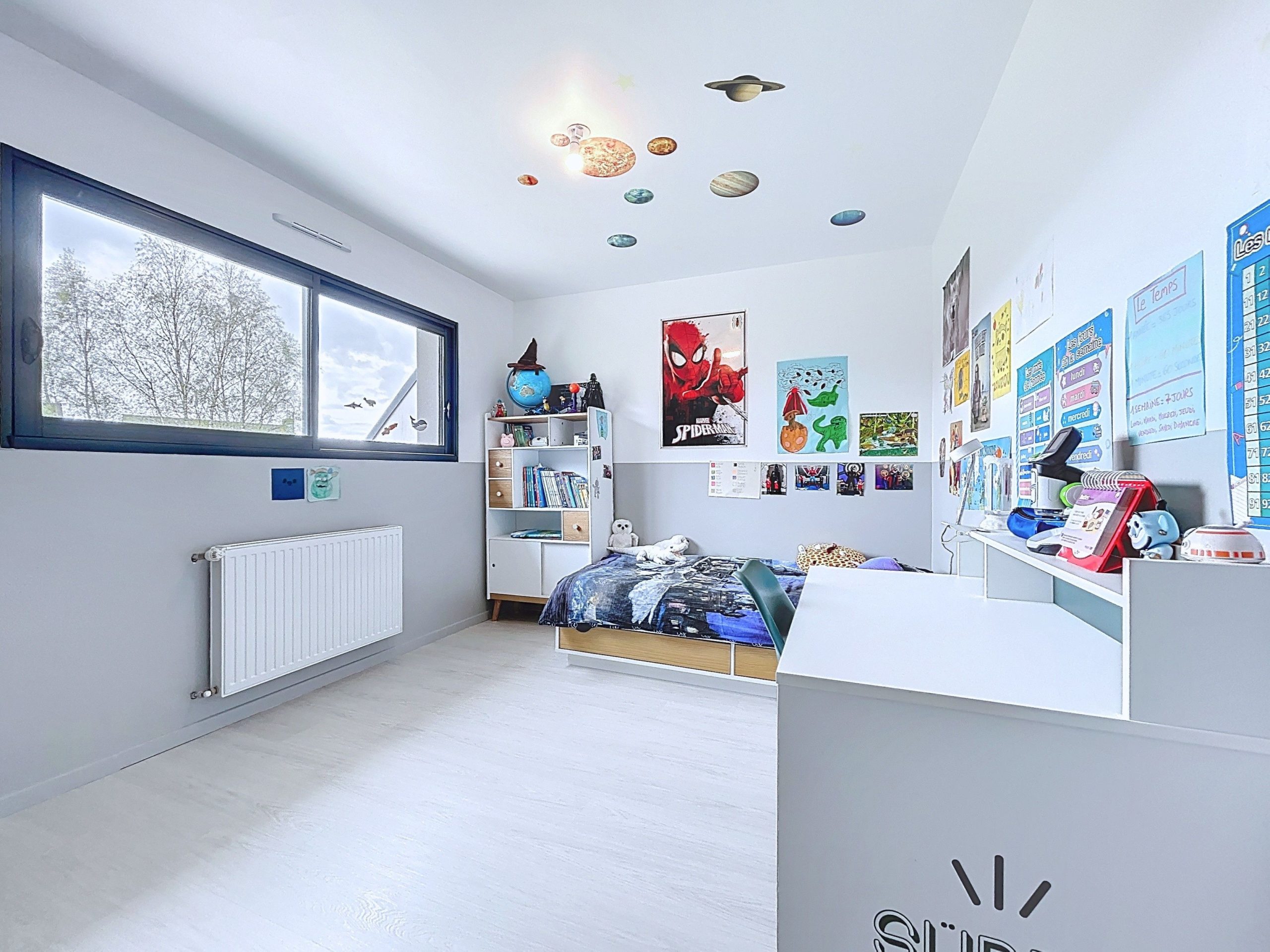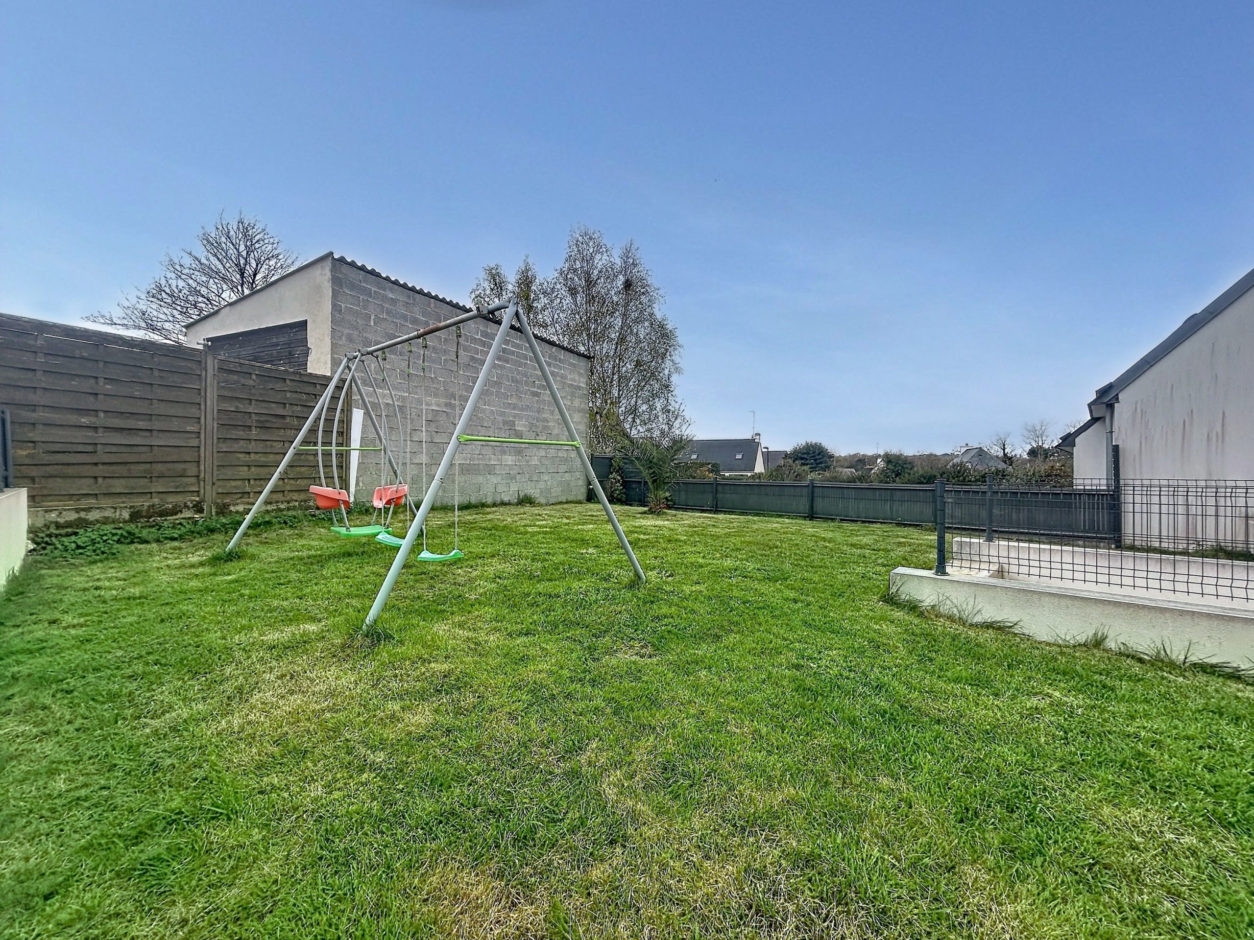 Côté extérieur, le jardin clos, exposé plein sud, est facile à entretenir. Deux places de stationnement sont également disponibles devant le garage.