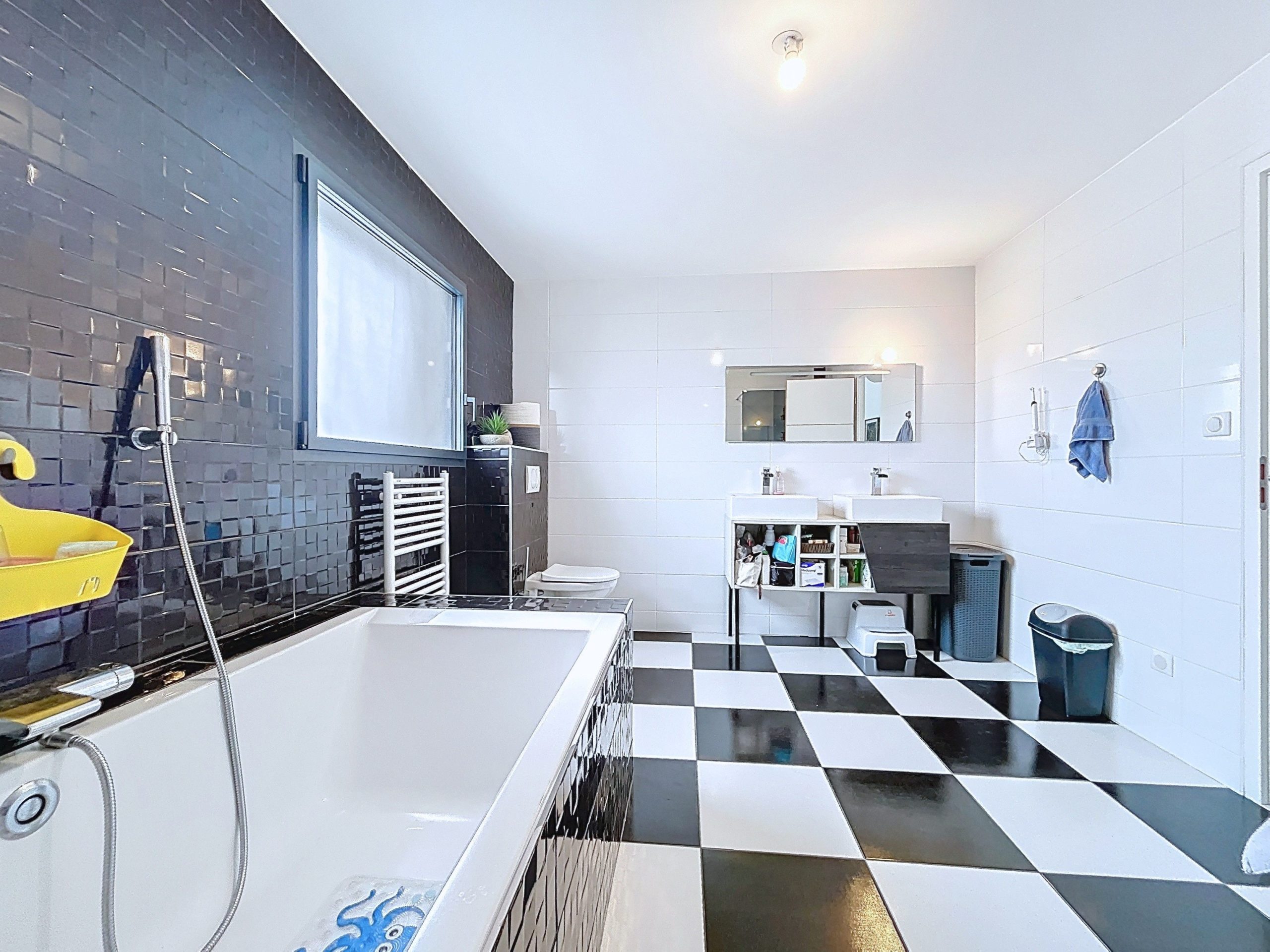 À l’étage, vous trouverez quatre belles chambres avec placards, dont une de 19 m², idéale pour une chambre parentale. Une salle d’eau équipée d’une douche et d’une baignoire, ainsi que des WC.
