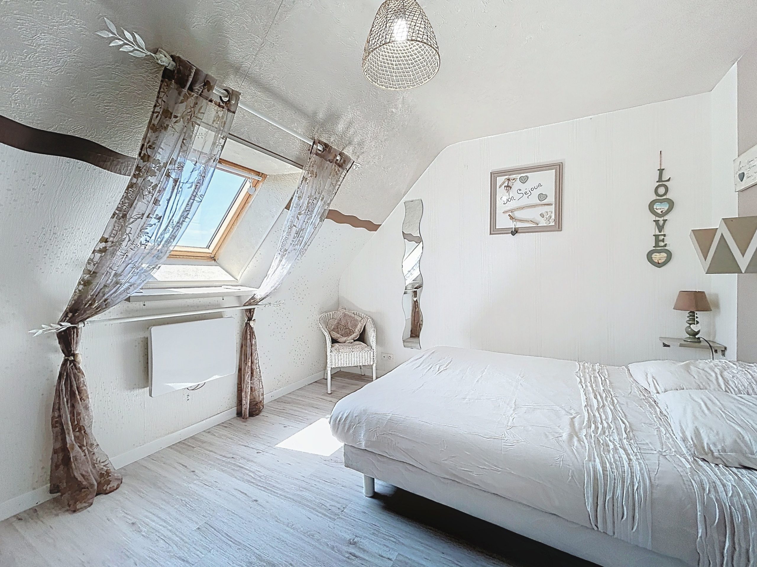 Au demi-niveau, une première chambre ainsi qu’une salle d’eau équipée d’une douche et d’une baignoire avec wc.